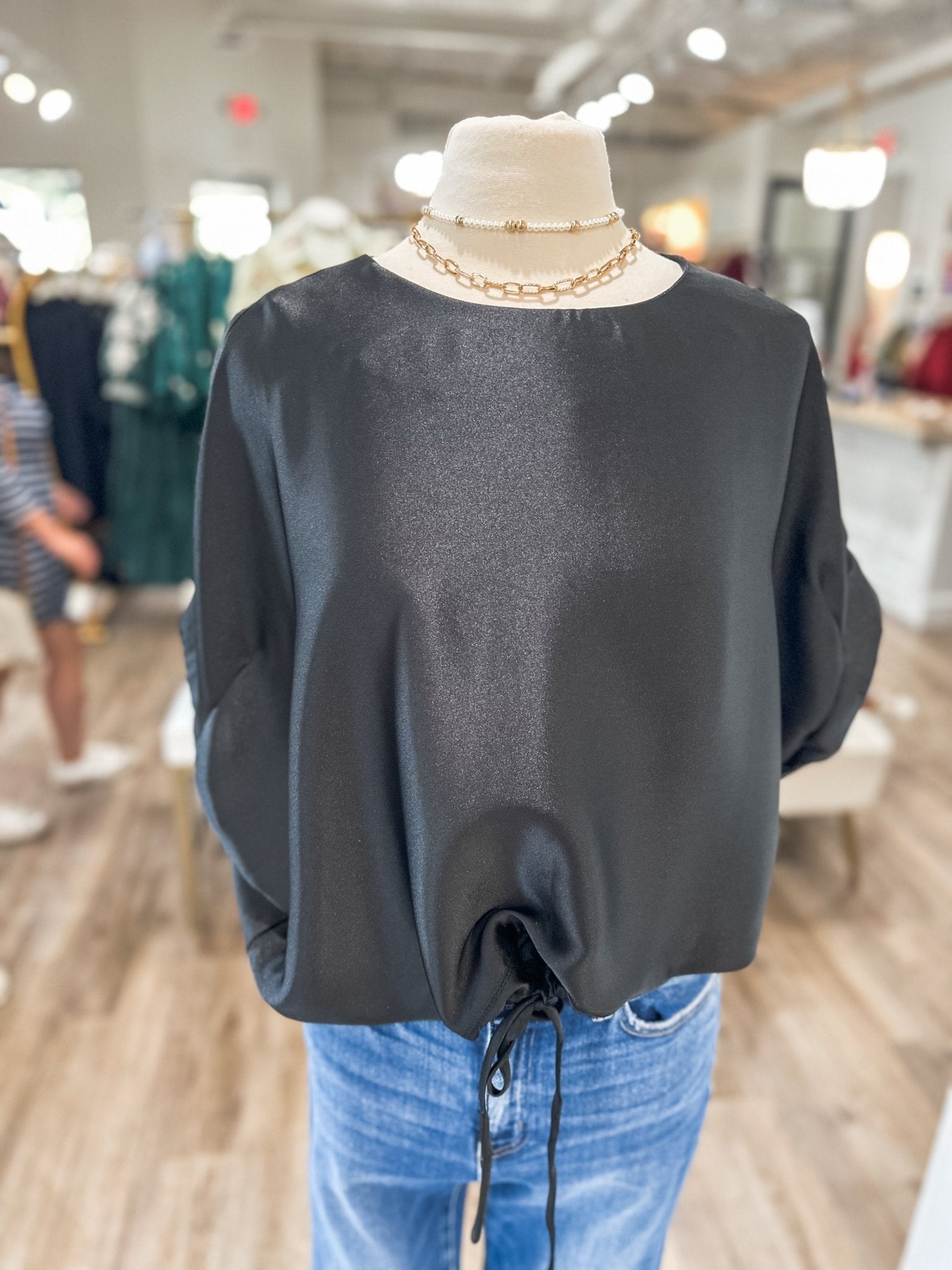 - Silky black fabric with a subtle sheen