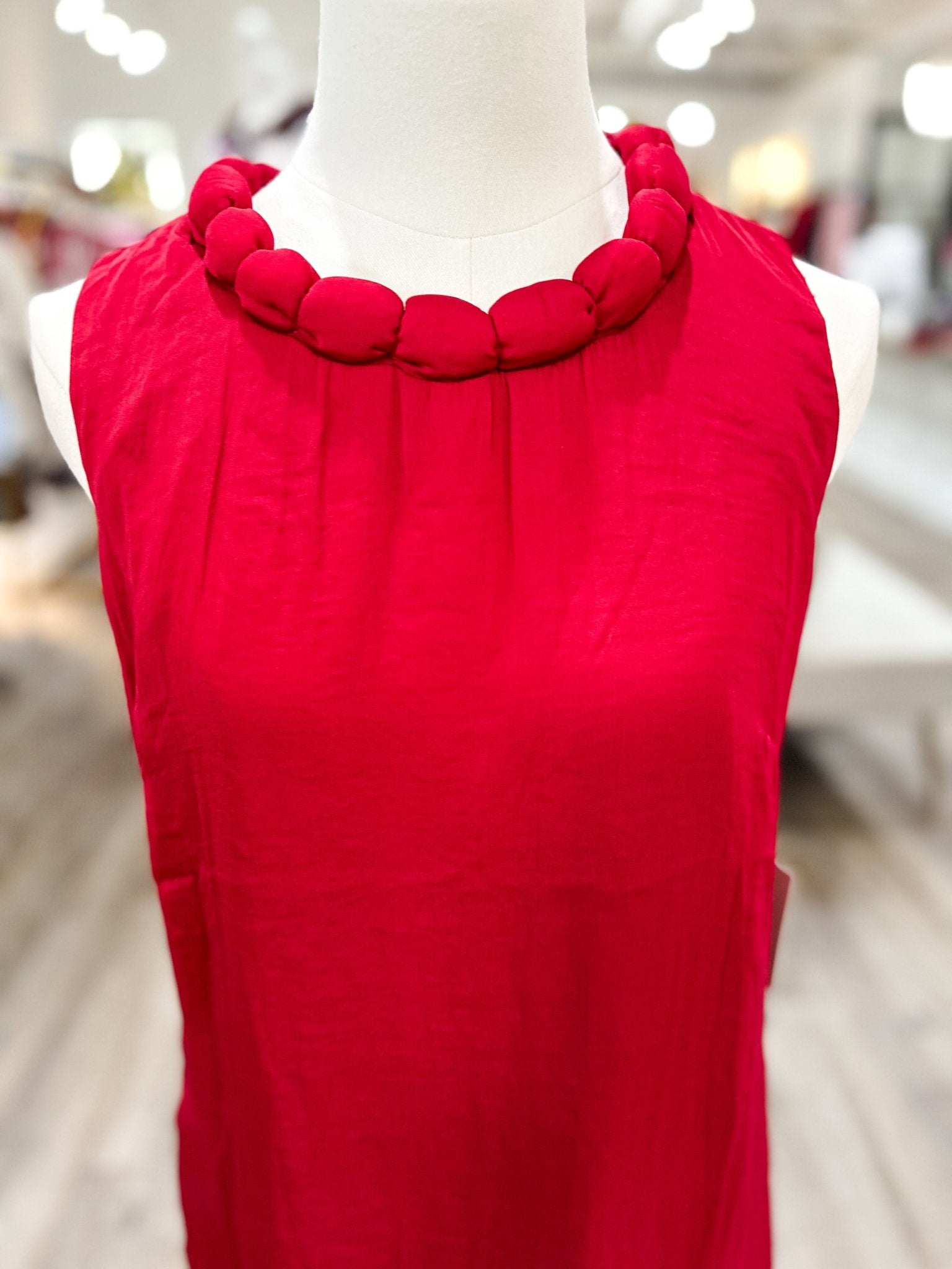 A standout crimson red dress designed to make an effortless statement. With its bold color and billowy silhouette, this piece is perfect for holiday gatherings, dinners out, or any time you want an easy, polished look without overthinking it.