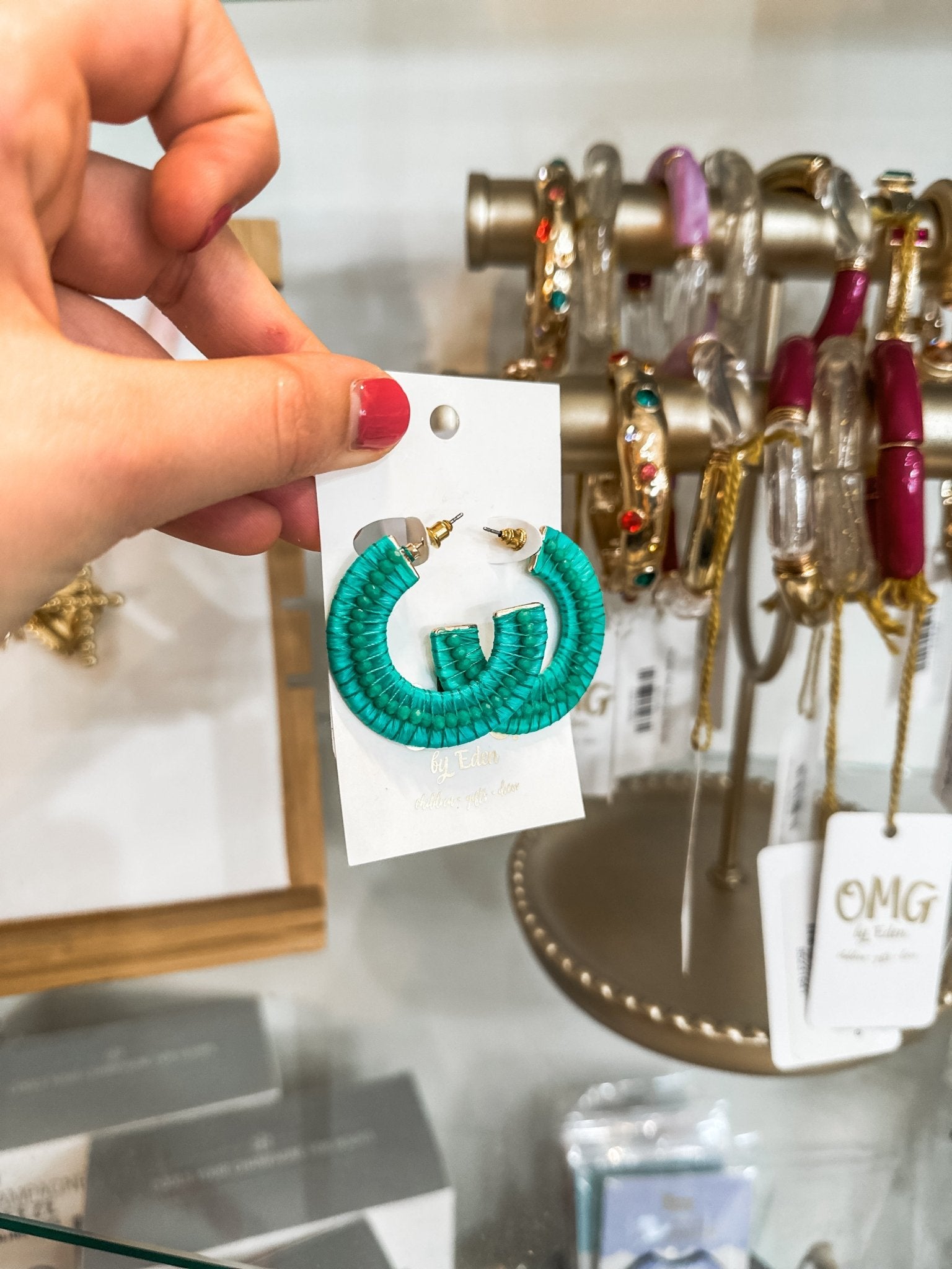 - Gold-tone hoop wrapped in green beading