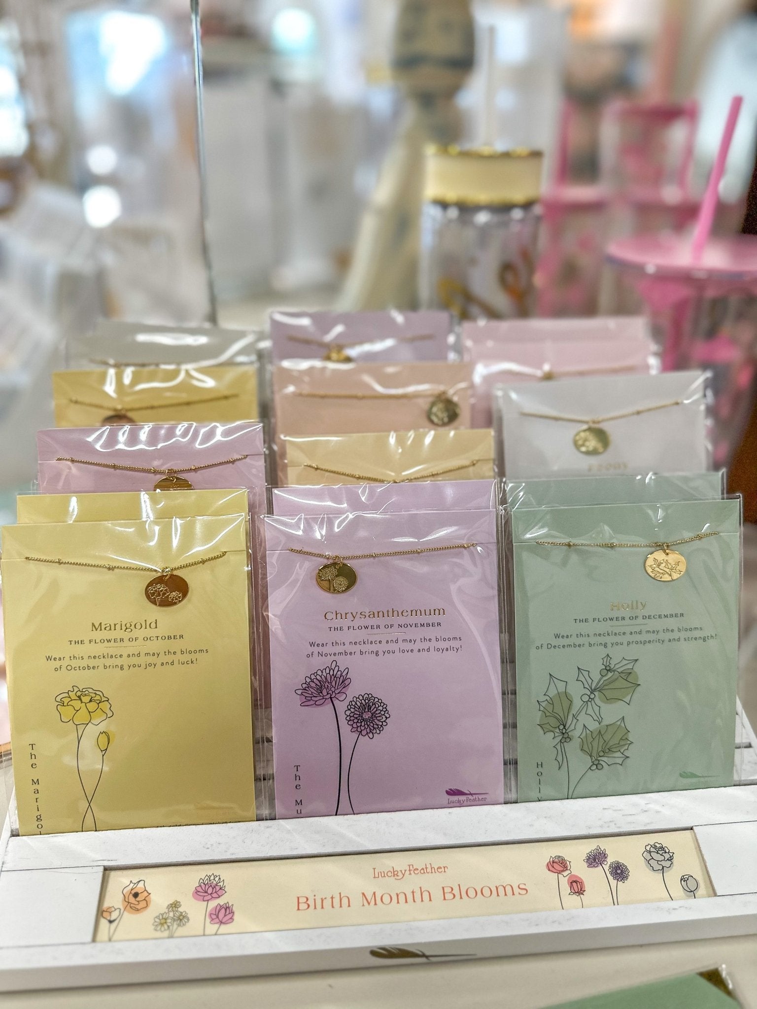At OMG we love the birth flower necklaces! They are so different! If you are needing a birthday gift come by the store and check out our birth flower necklaces! They are so pretty!
