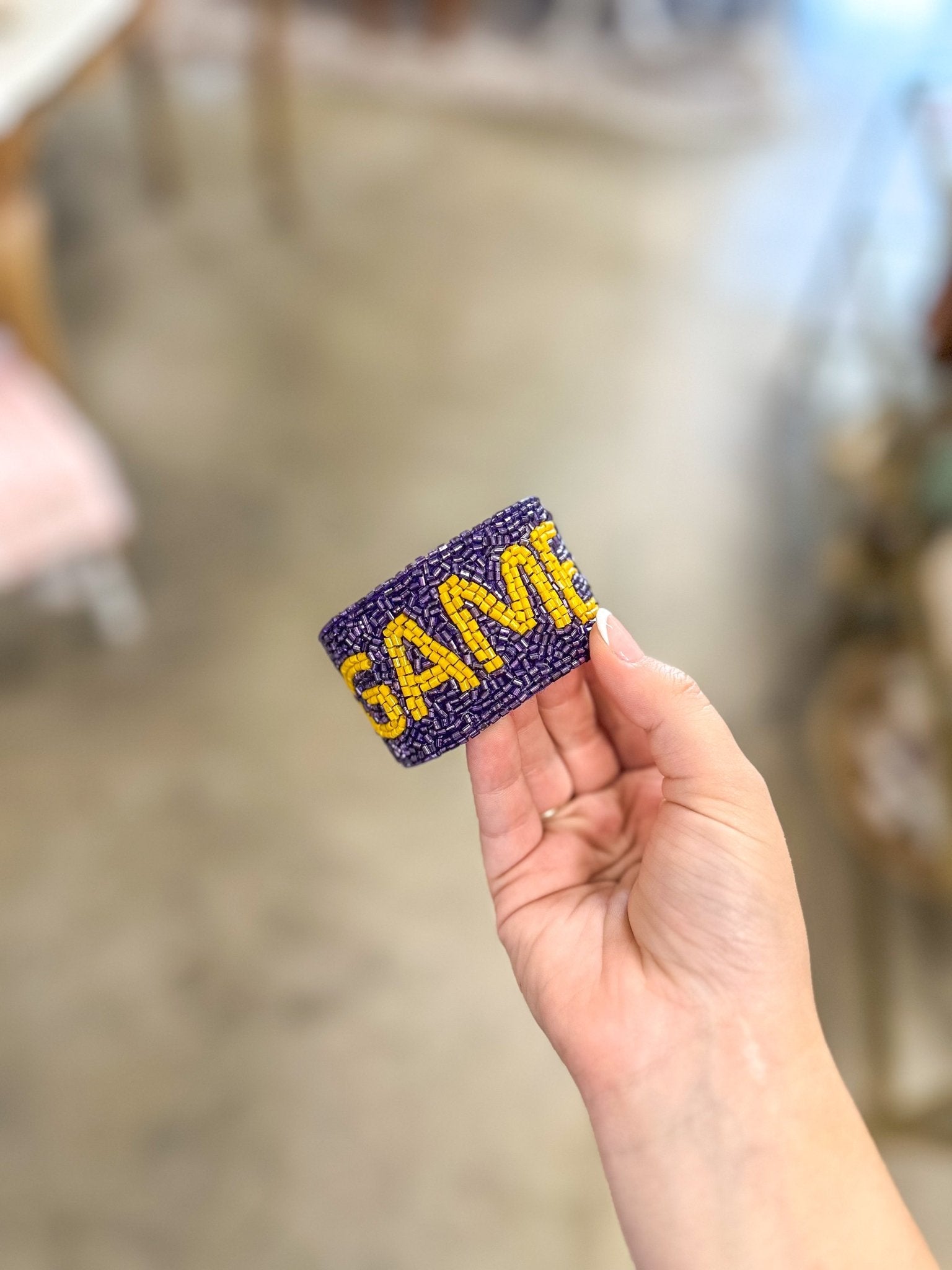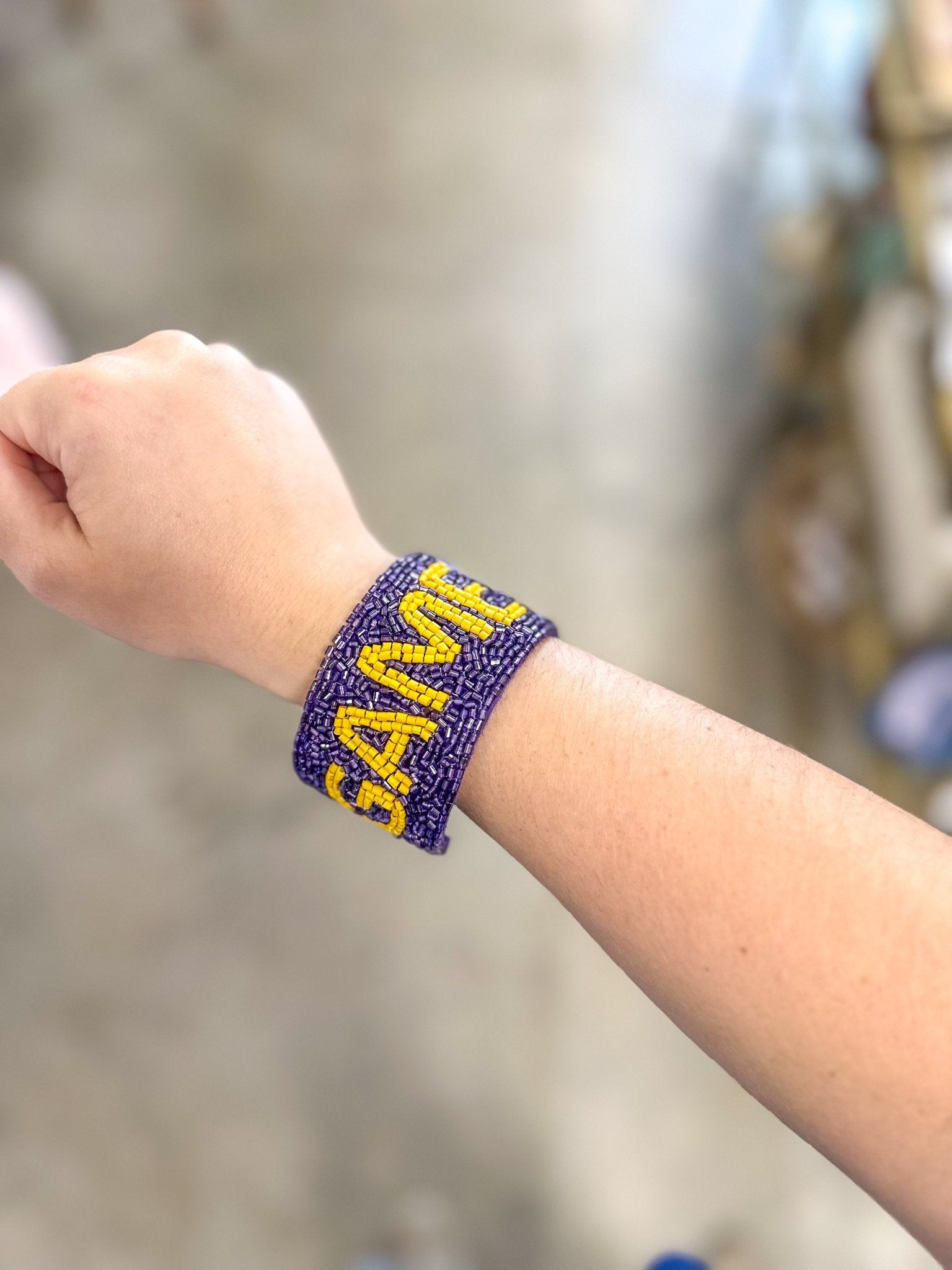 Add the perfect finishing touch to your spirited look with the Purple & Gold Game Day Beaded Snap Bracelet! Featuring bold beaded lettering and vibrant team colors, this bracelet brings sparkle and sass to your sideline style — whether you're tailgating, stadium-bound, or just repping from home.