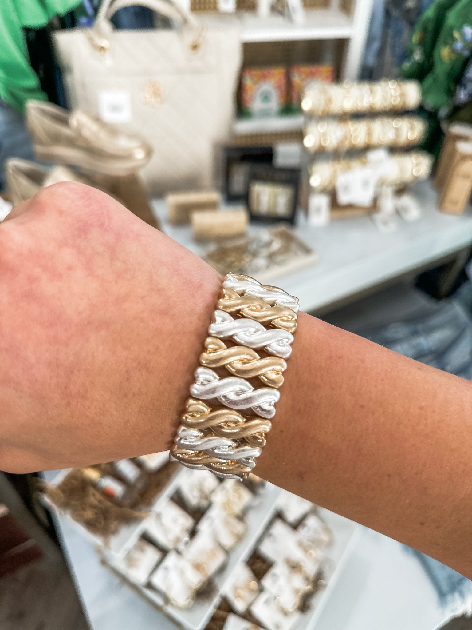 This silver and gold braided bracelet adds the perfect touch of shine to your everyday stack. Its stretchy fit makes it effortless to slip on and oh-so-comfortable to wear, while the metallic braid detail gives it that chic, timeless feel.
