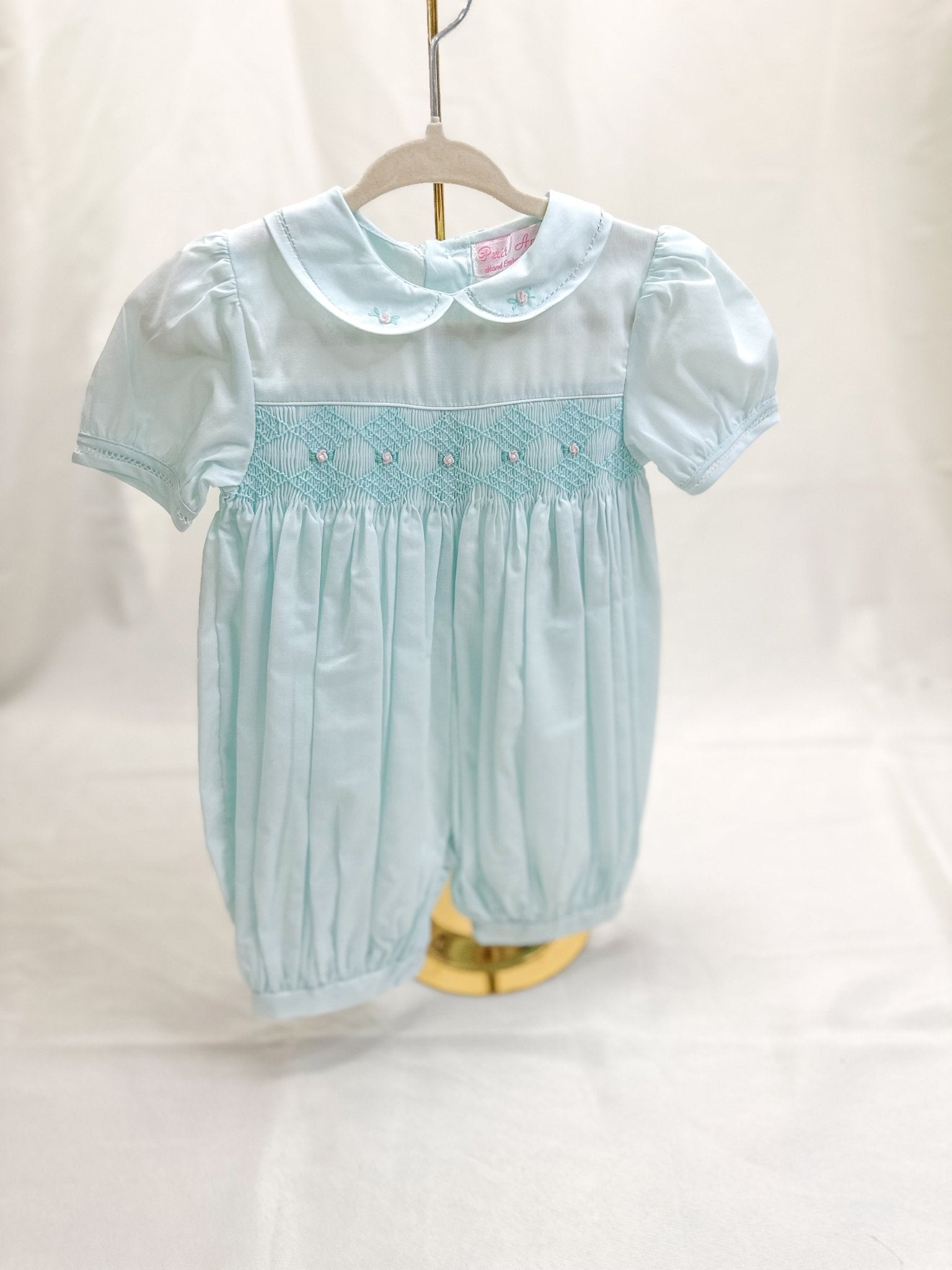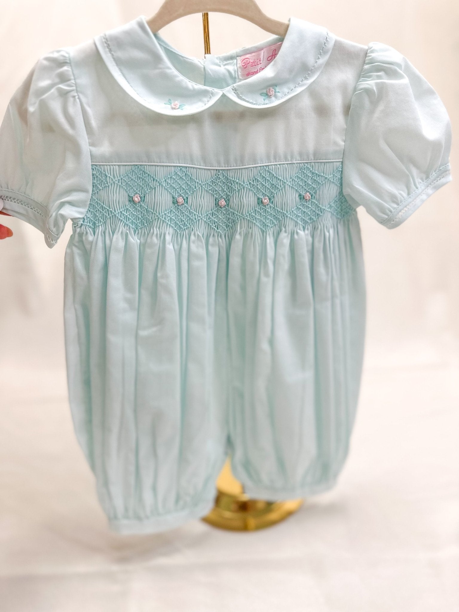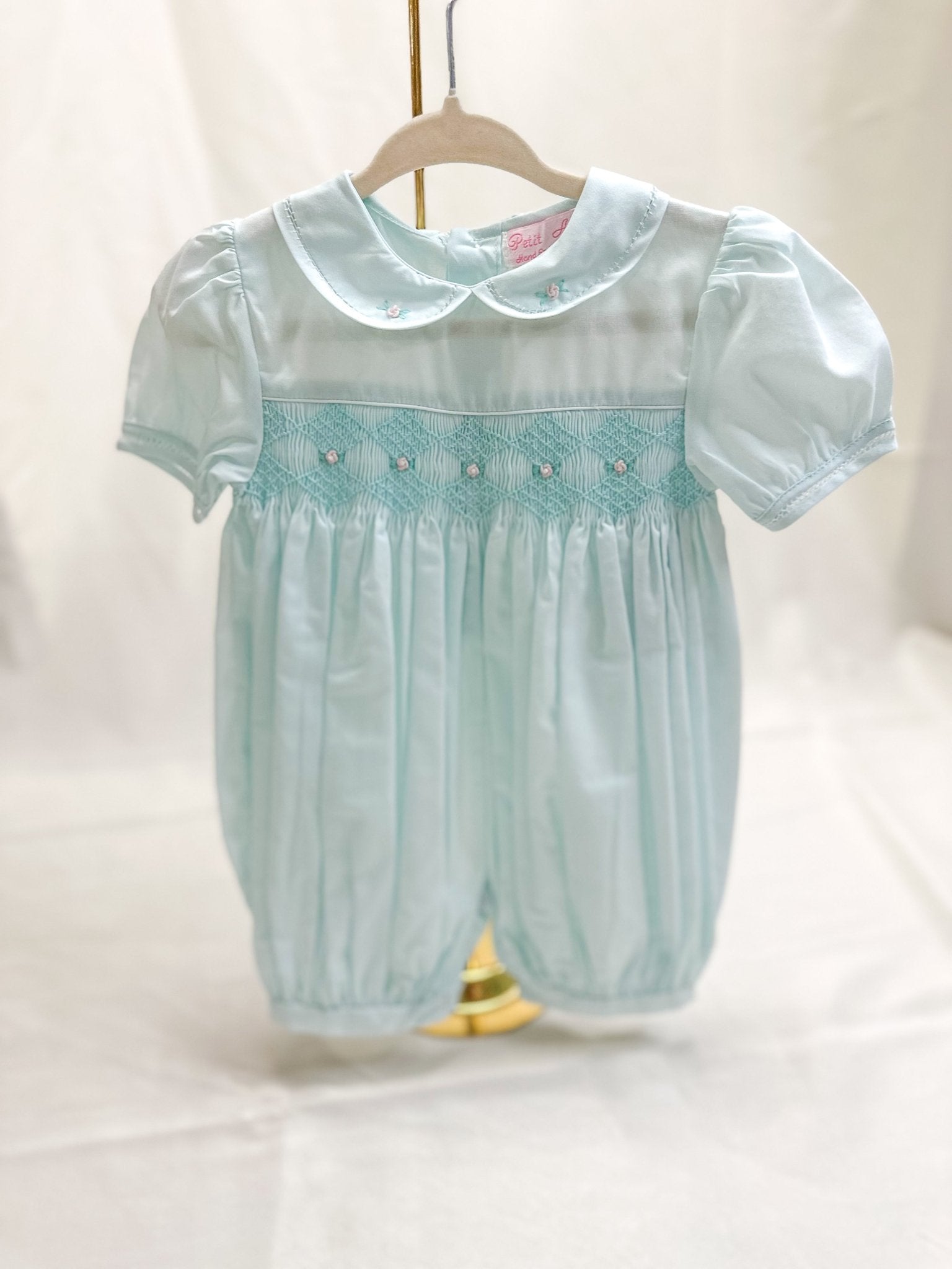 • Soft mint fabric with intricate diamond smocking across the chest