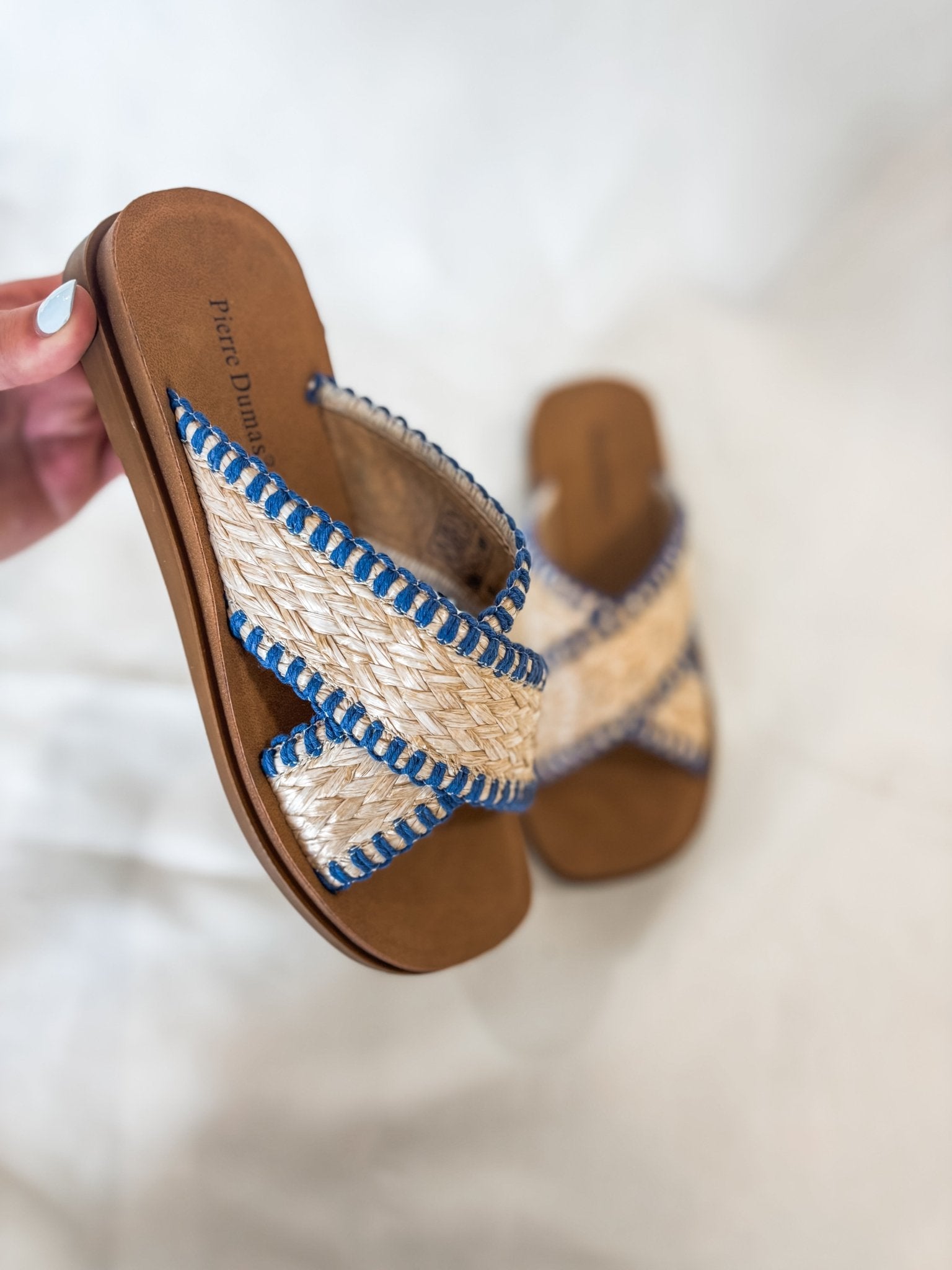 A fun twist on a neutral with the extra pop of NAVY BLUE; perfect for sunny days, weekend farmers market outings, or poolside hangs. Natural woven straps cross the foot with navy stitching that adds the perfect pop of color. The base is lightly cushioned for an easy, relaxed fit. Comfortable and flexible with a supportive slip-on design you’ll wear again and again.