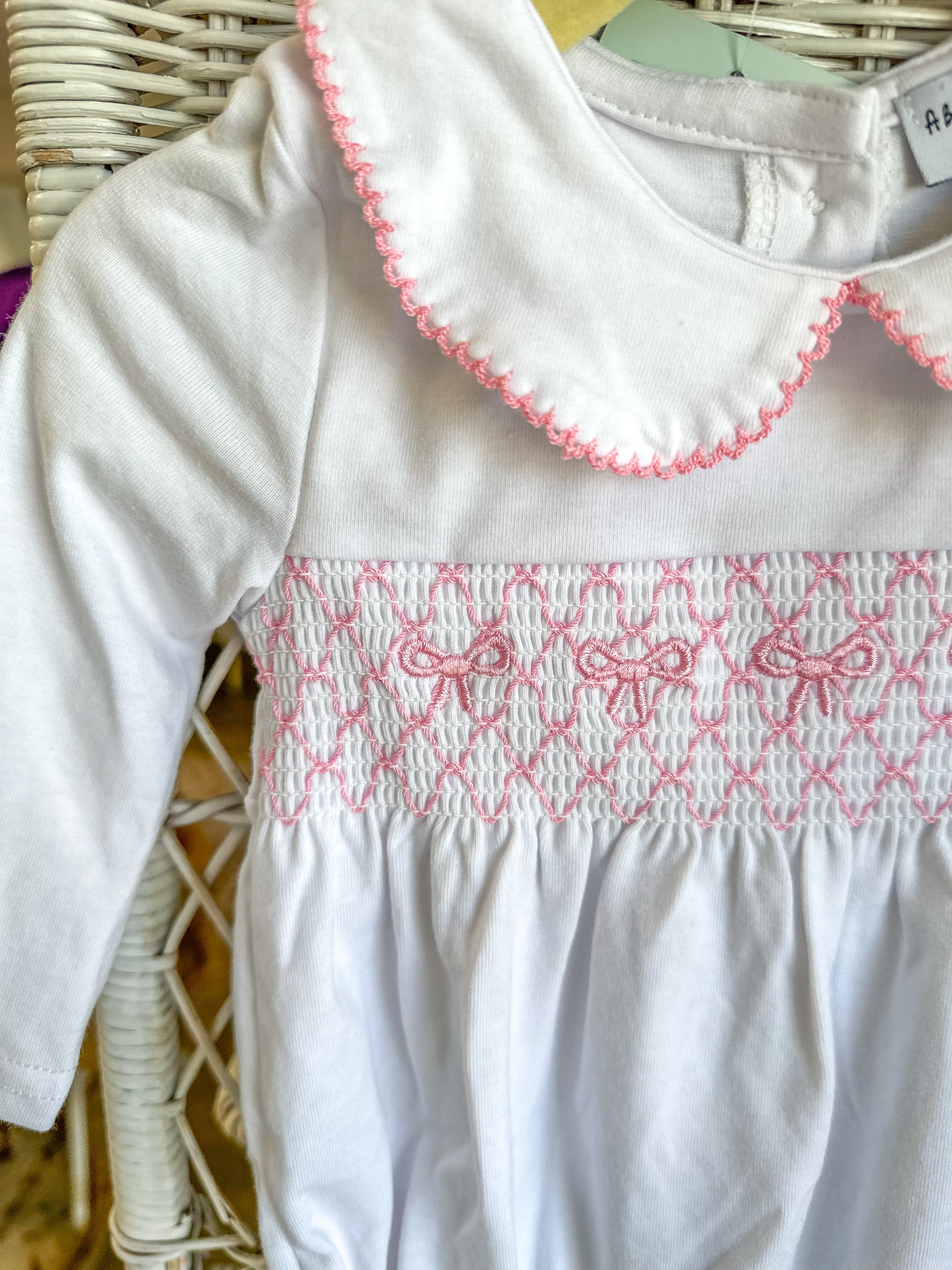Classic, timeless, and oh-so-sweet—this smocked romper is perfect for family photos, church, or everyday play with a girly touch.