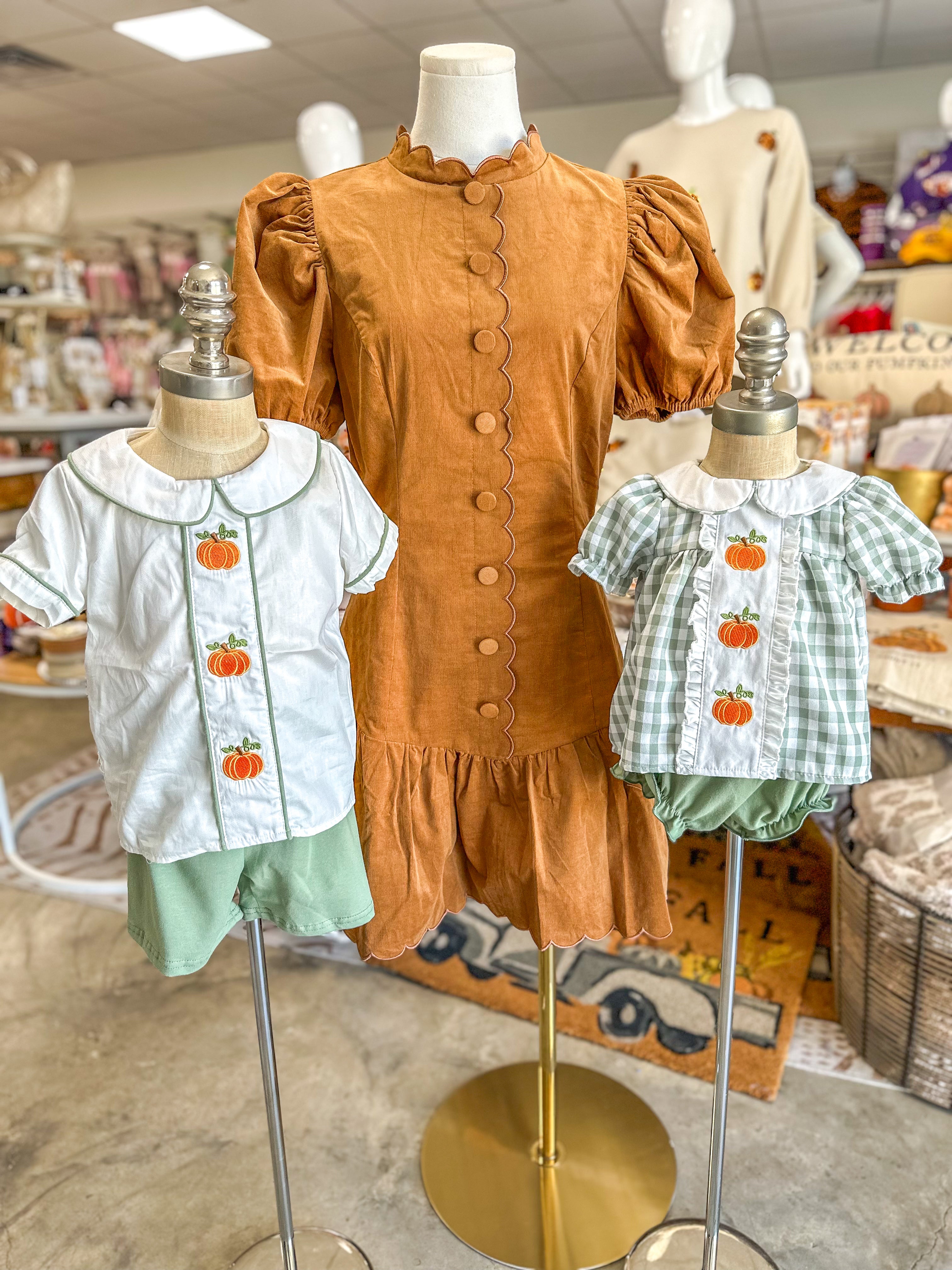 Sweet, structured, and ready to steal the spotlight — the Toffee Twirl Scallop Mini Dress brings charm to any fall occasion. Featuring playful puff sleeves, covered button detailing, and a flirty drop-waist skirt with scalloped edges, this warm toffee hue pairs perfectly with gold accents and autumn boots. The tailored fit flatters while the whimsical details keep it fun and feminine.