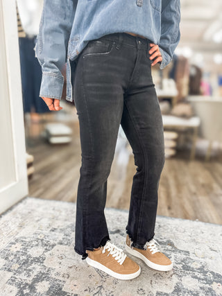 Favorite Pair Mid Rise Bootcut Black Risen Denim Jeans Unbalanced Hem