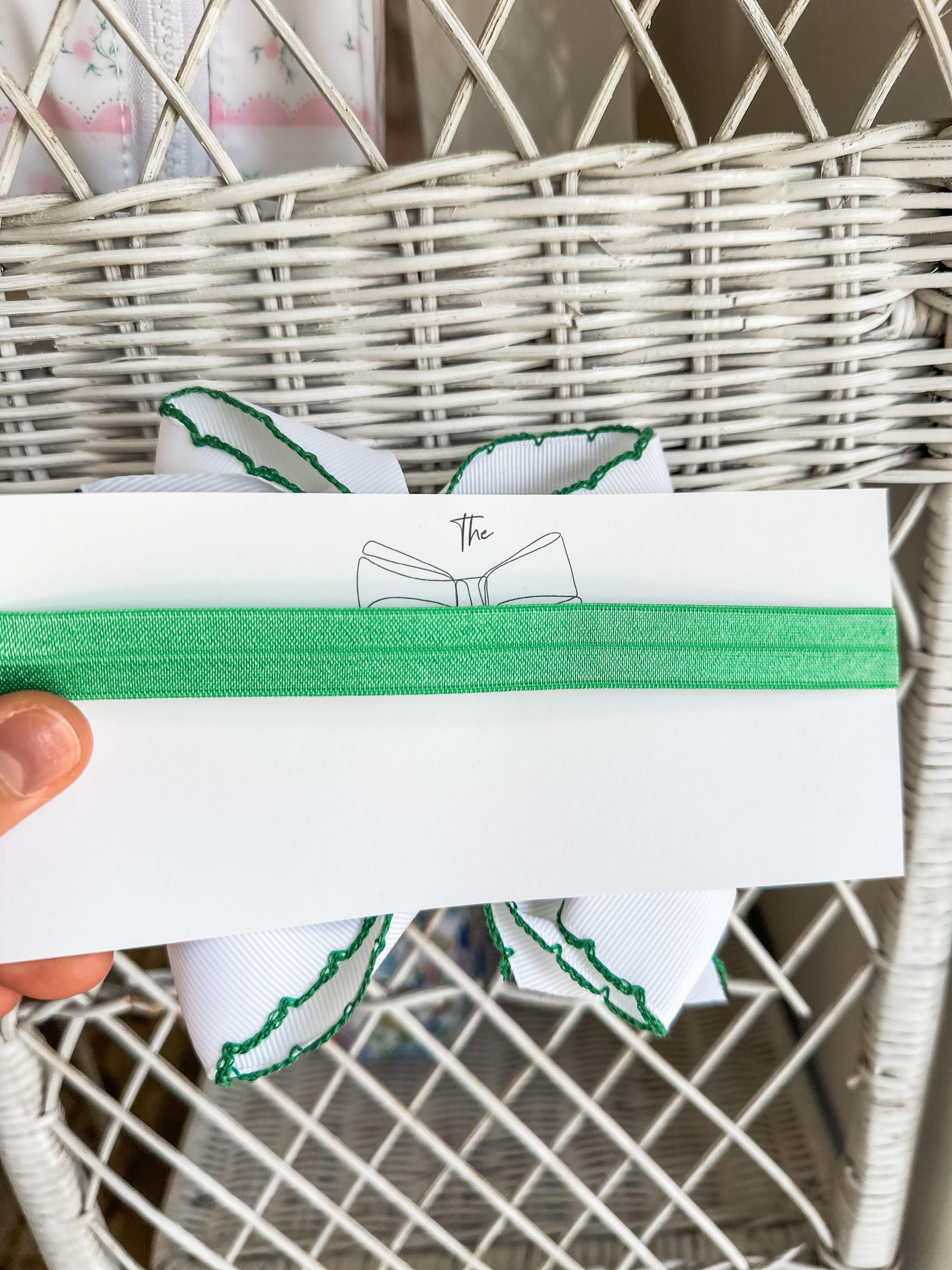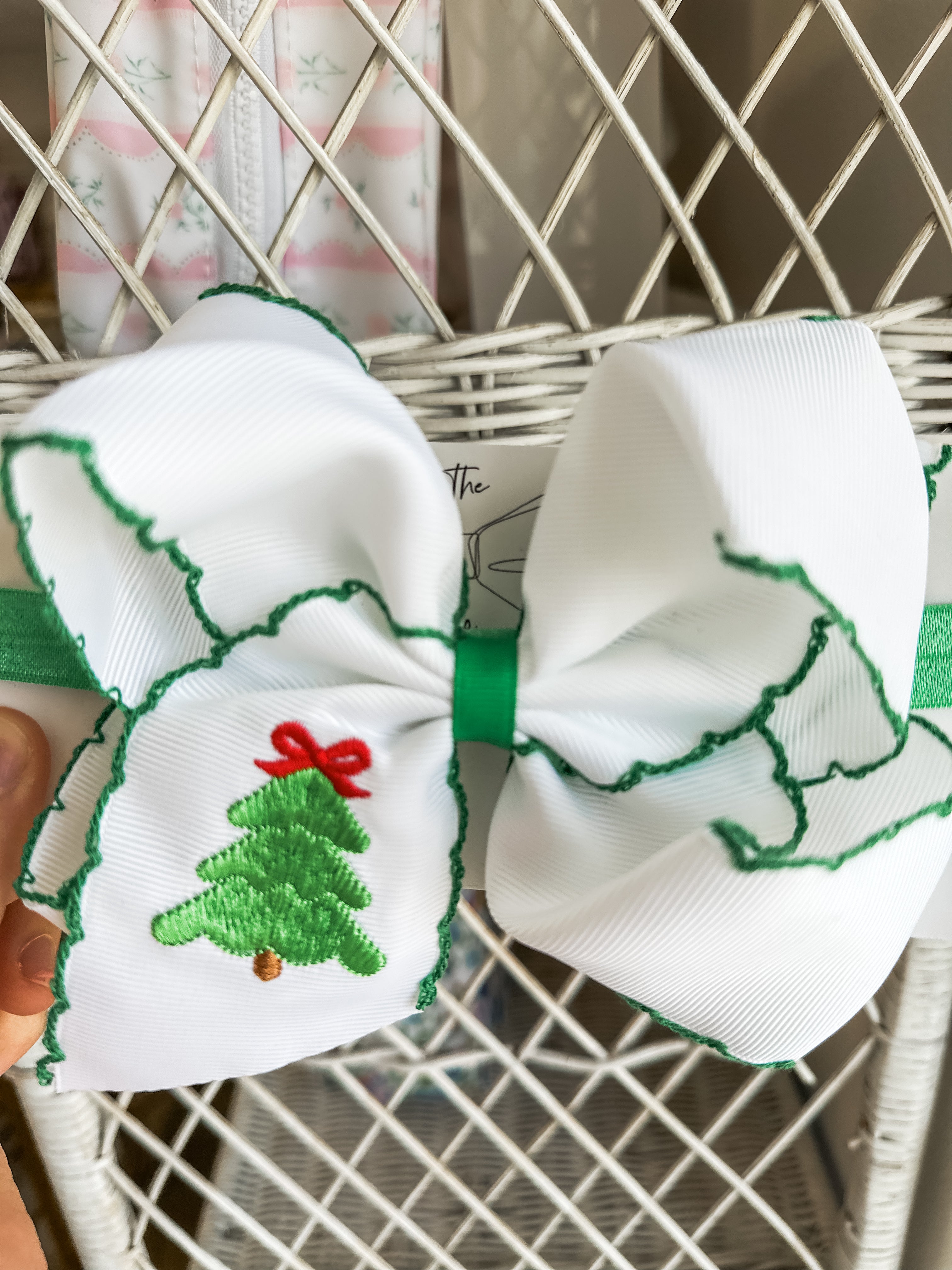 Deck the halls in style with this festive embroidered bow! 🌟 The crisp white ribbon is detailed with a charming green Christmas tree and finished with a stretchy elastic headband for a comfortable fit. Perfect for holiday outfits, Christmas card photos, and festive celebrations.