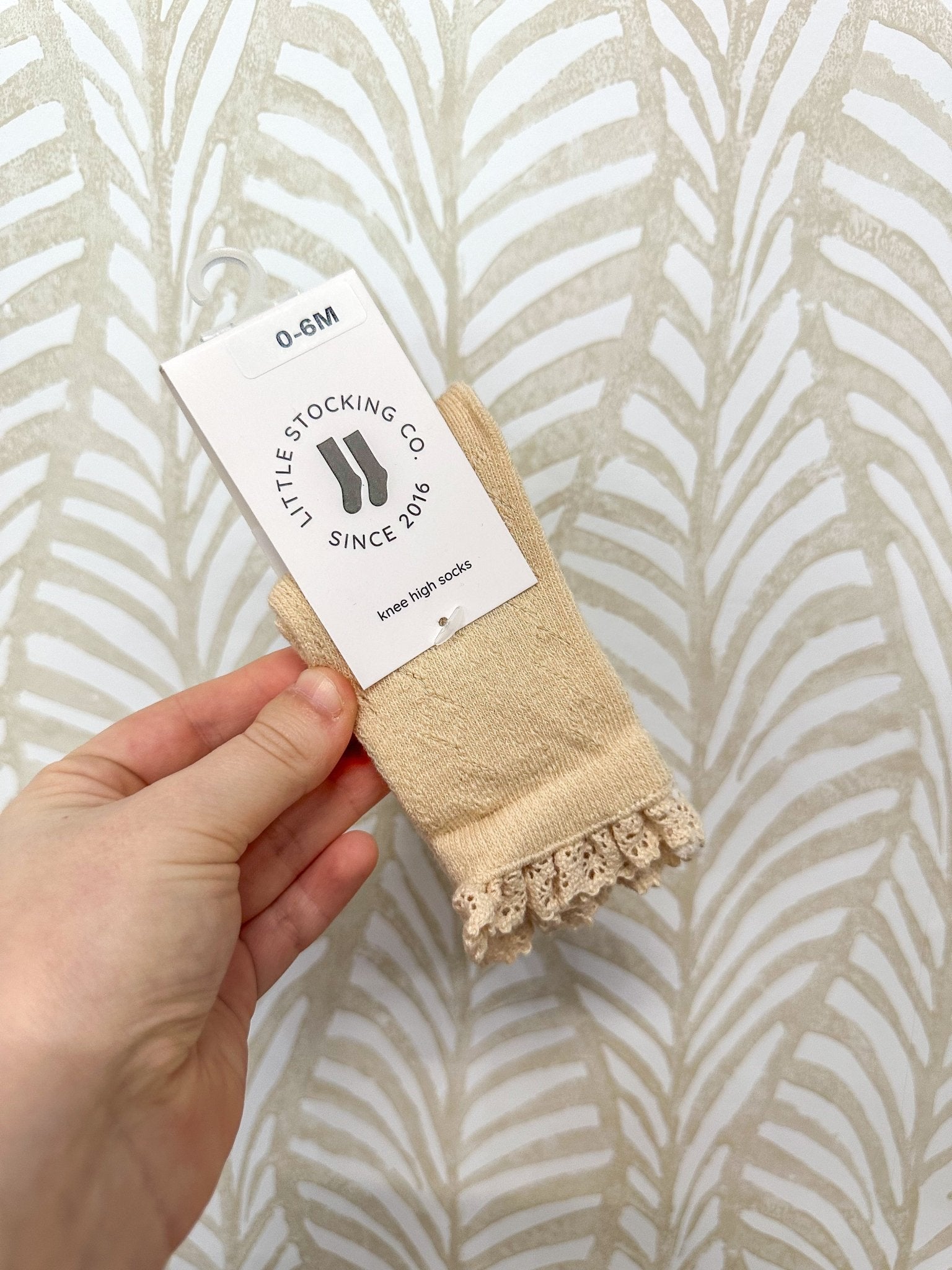 These Vanilla Fancy Lace Top Knee-High Socks add a sweet and stylish touch to any little outfit. Available in four sizes—from newborn to 6 years—they’re perfect for keeping tiny toes cozy while showing off delicate lace trim. Soft, comfy, and oh-so-cute, these socks make every step a charming adventure!