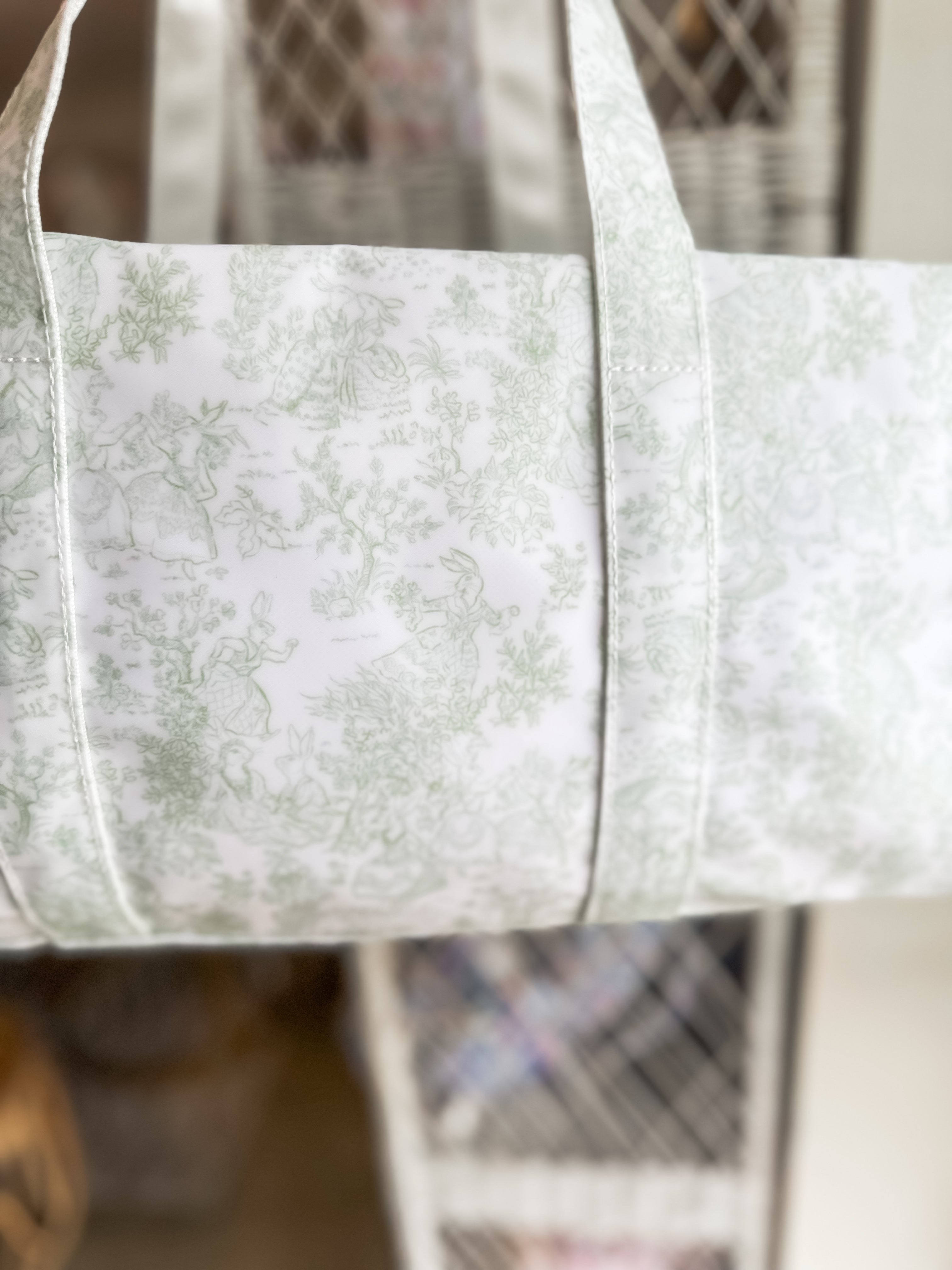 Whether it’s a quick overnight stay, a weekend getaway, or just carrying all the extras, this weekender bag is as functional as it is charming. The soft green bunny toile print brings a timeless, whimsical touch while still keeping things practical for travel.
