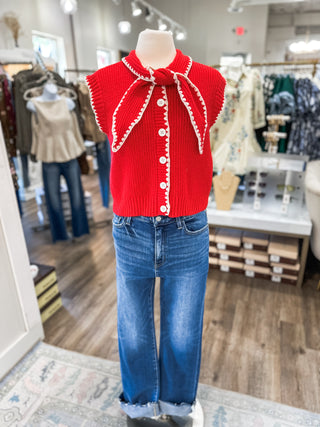 Red Varsity Stripe Gold Metal Button Sleeveless Sweater
