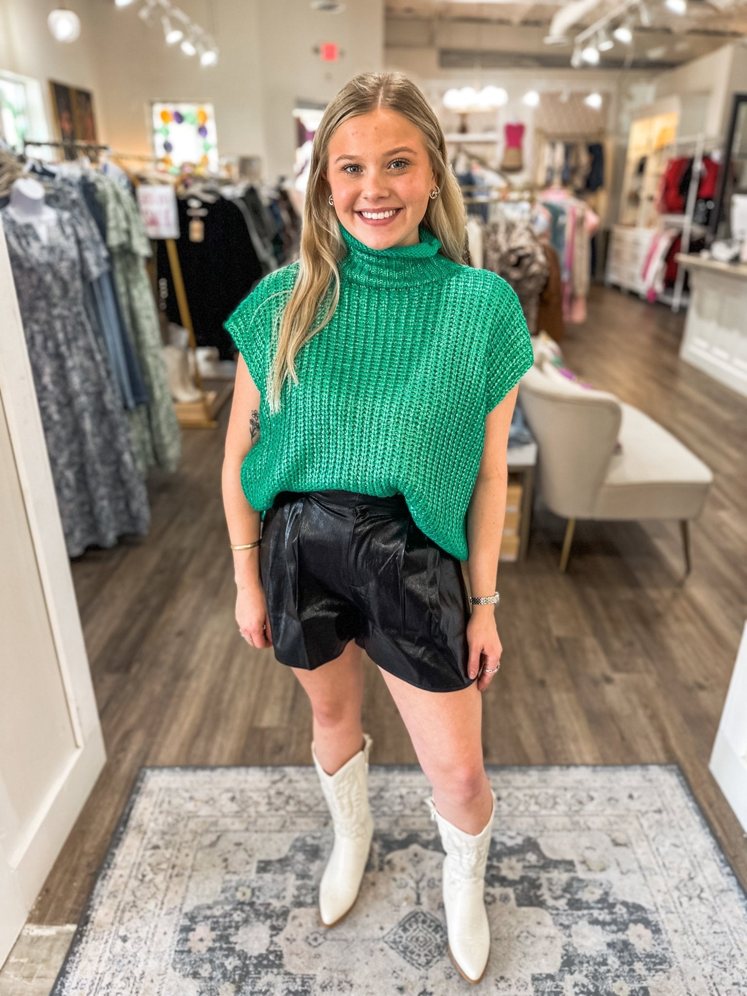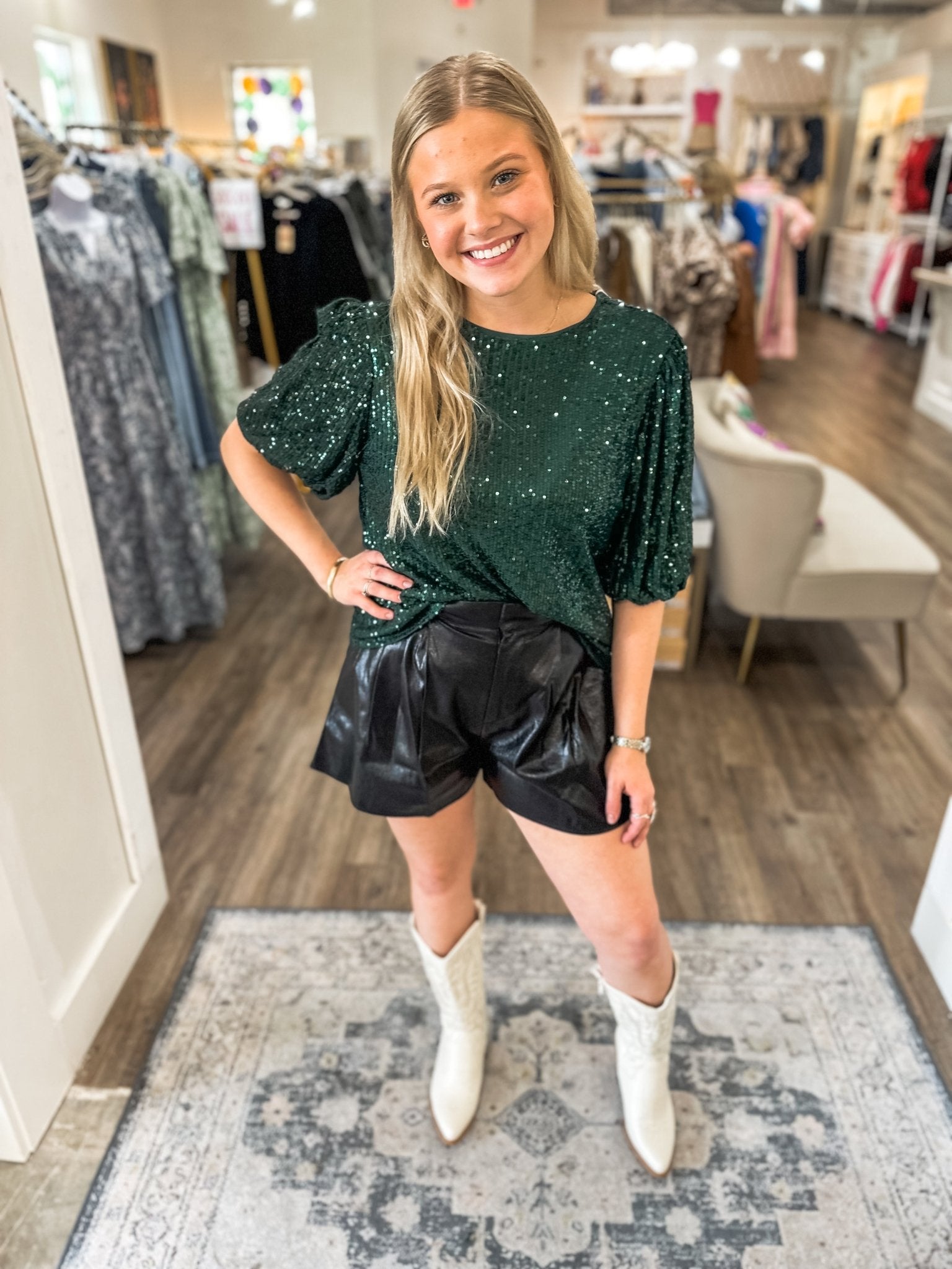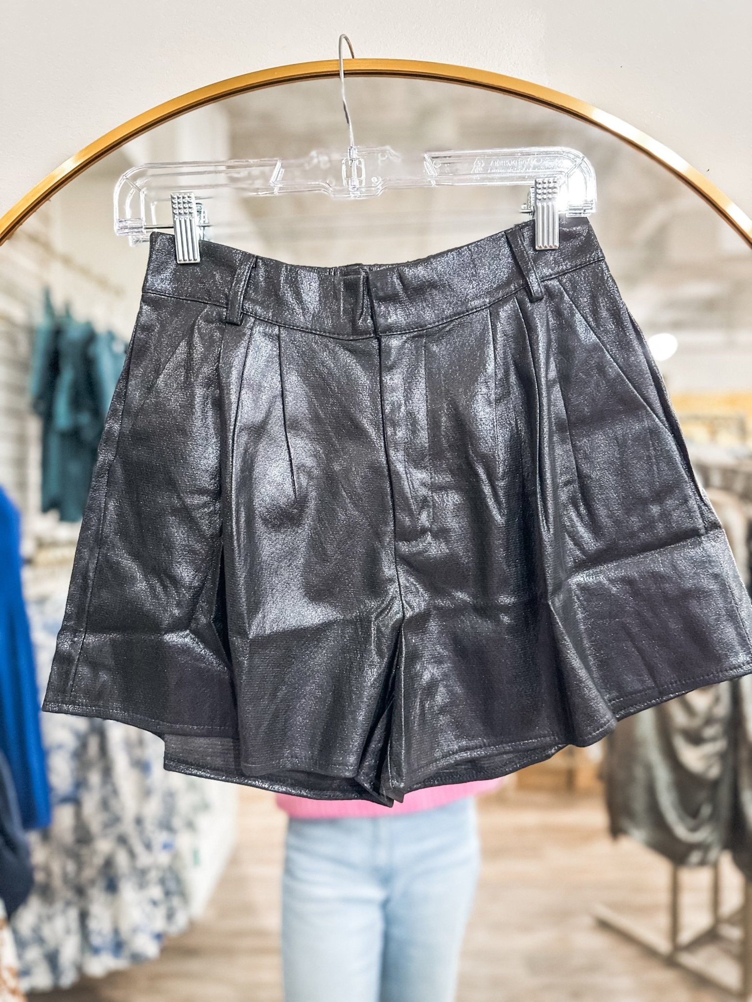 Turn heads from dusk to dance floor in the Shimmer Throughout the Night Shorts – Black Edition. These high-waisted faux leather shorts feature a sleek, glossy finish with subtle pleating for added movement and glam. Whether you're styling for a concert, party, or holiday soirée, this edgy staple brings the shine and the shape.