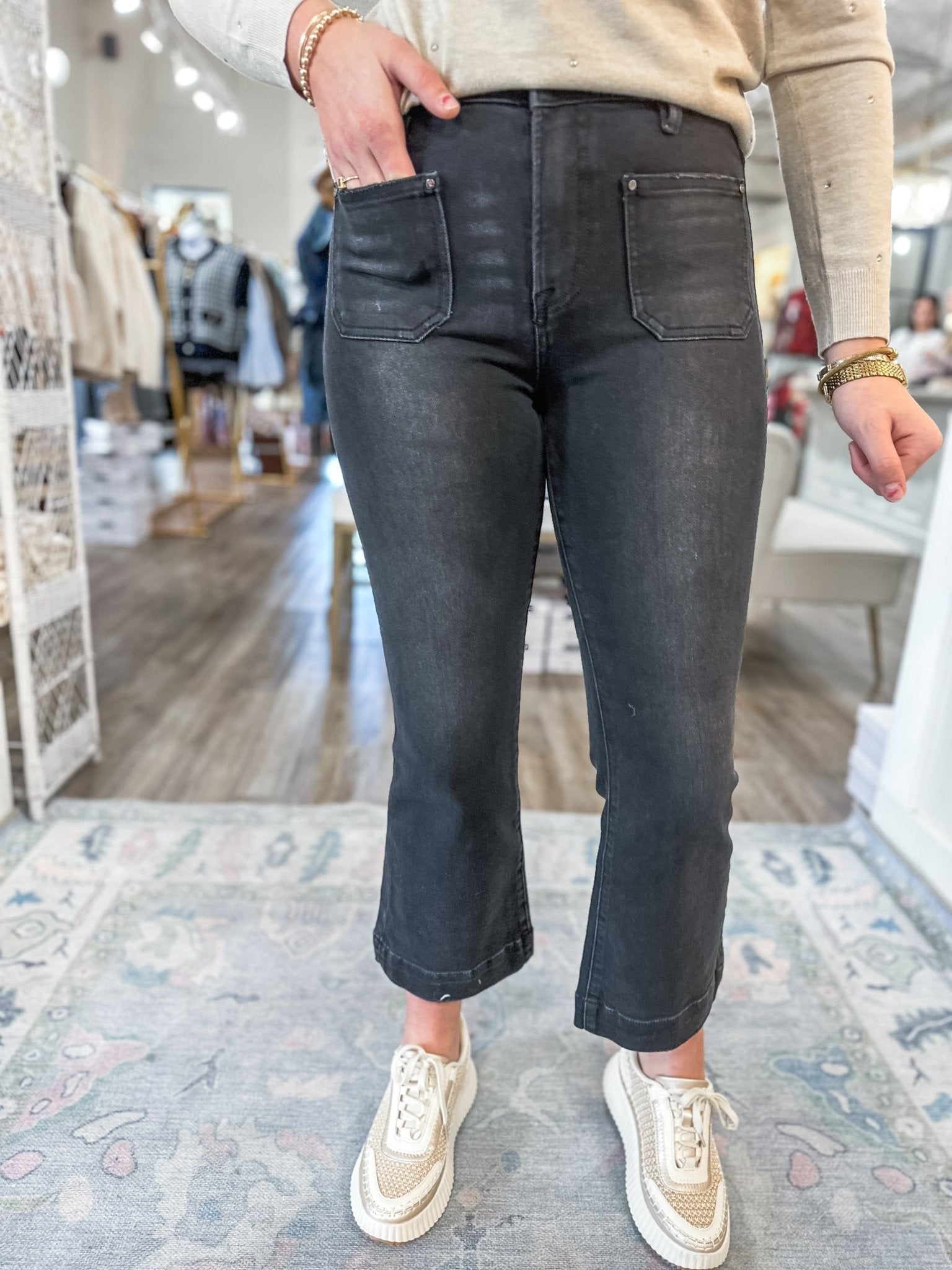 Your new go-to black denim—these Risen jeans give you that effortlessly flattering fit with a trendy cropped flare and the cutest front patch pockets. Easy to dress up with a sweater or keep casual with sneakers.