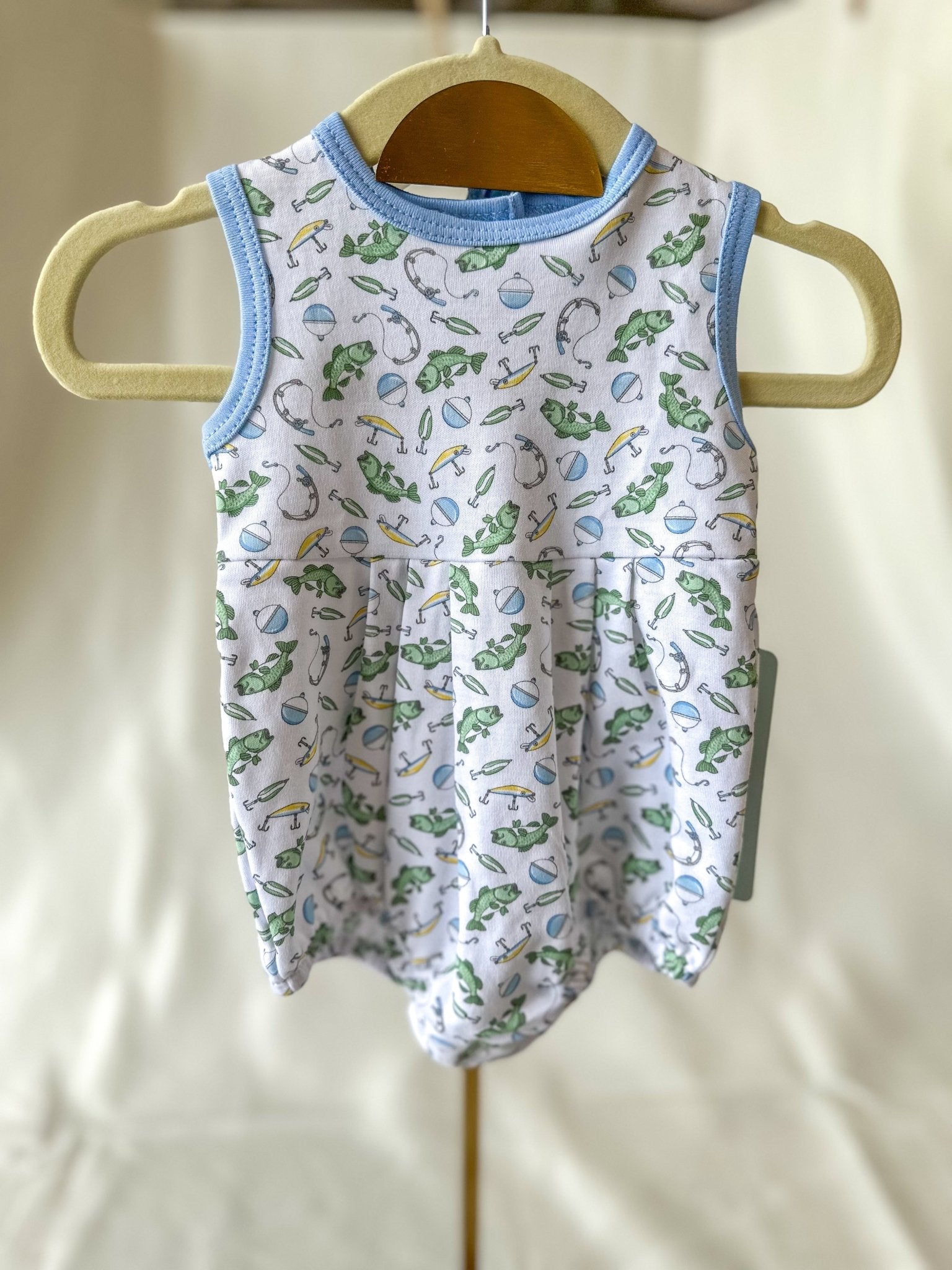 Cute enough to catch compliments all summer long! This adorable bubble features a playful fishing-themed print--hooks, lines, and sinkers included--making it perfect for your tiniest outdoorsman. Made from soft, breathable fabric, it keeps baby cool and comfy on even the warmest days. Perfect for lake days, crawfish boils, sunny playdates, or casual family outings.