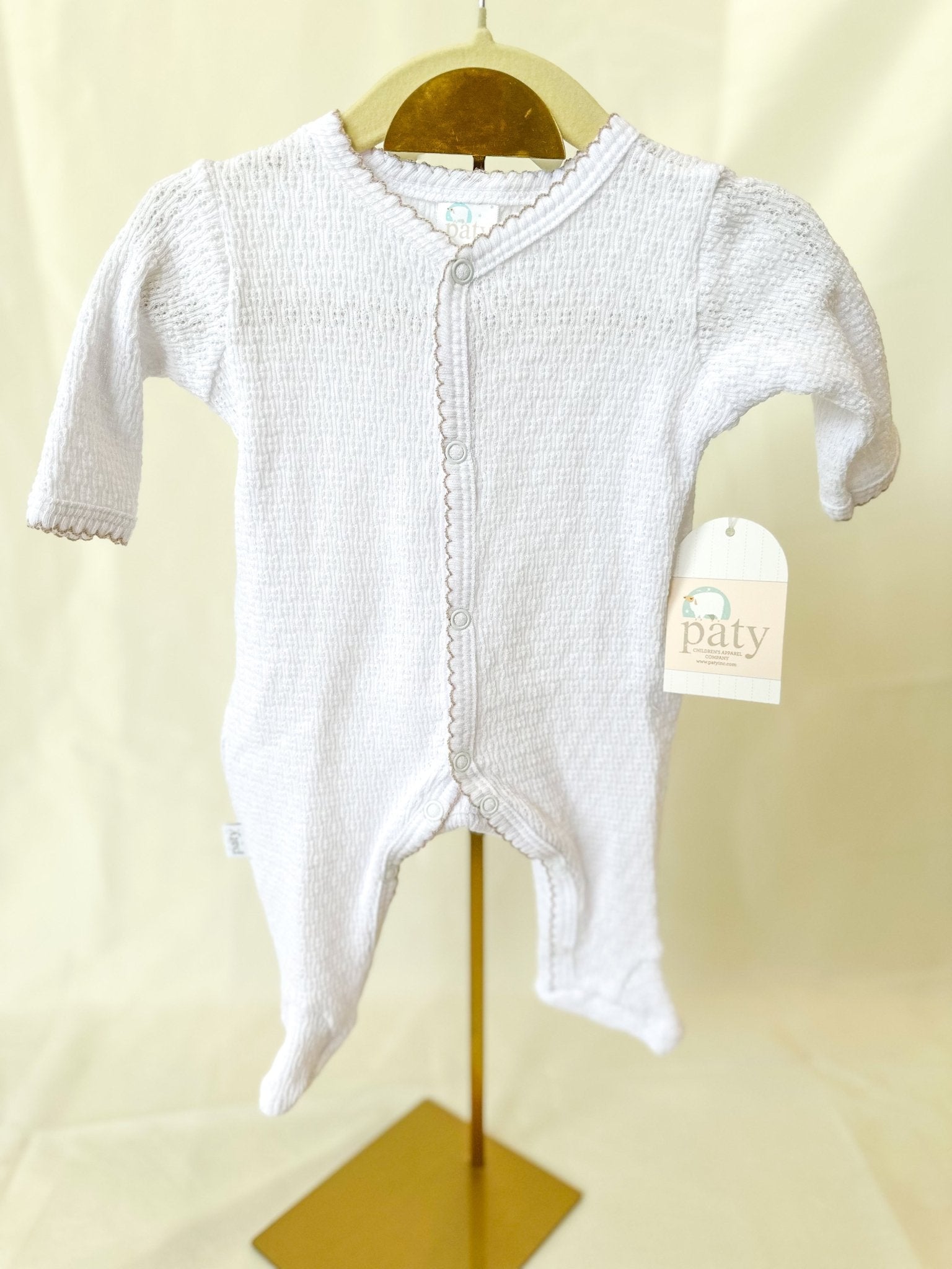Whether you're welcoming a little one home or choosing a sweet, giftable basic, this Paty footie brings elevated simplicity with soft sand trim. The neutral tone pairs effortlessly with anything and makes it perfect for monogramming or everyday wear.