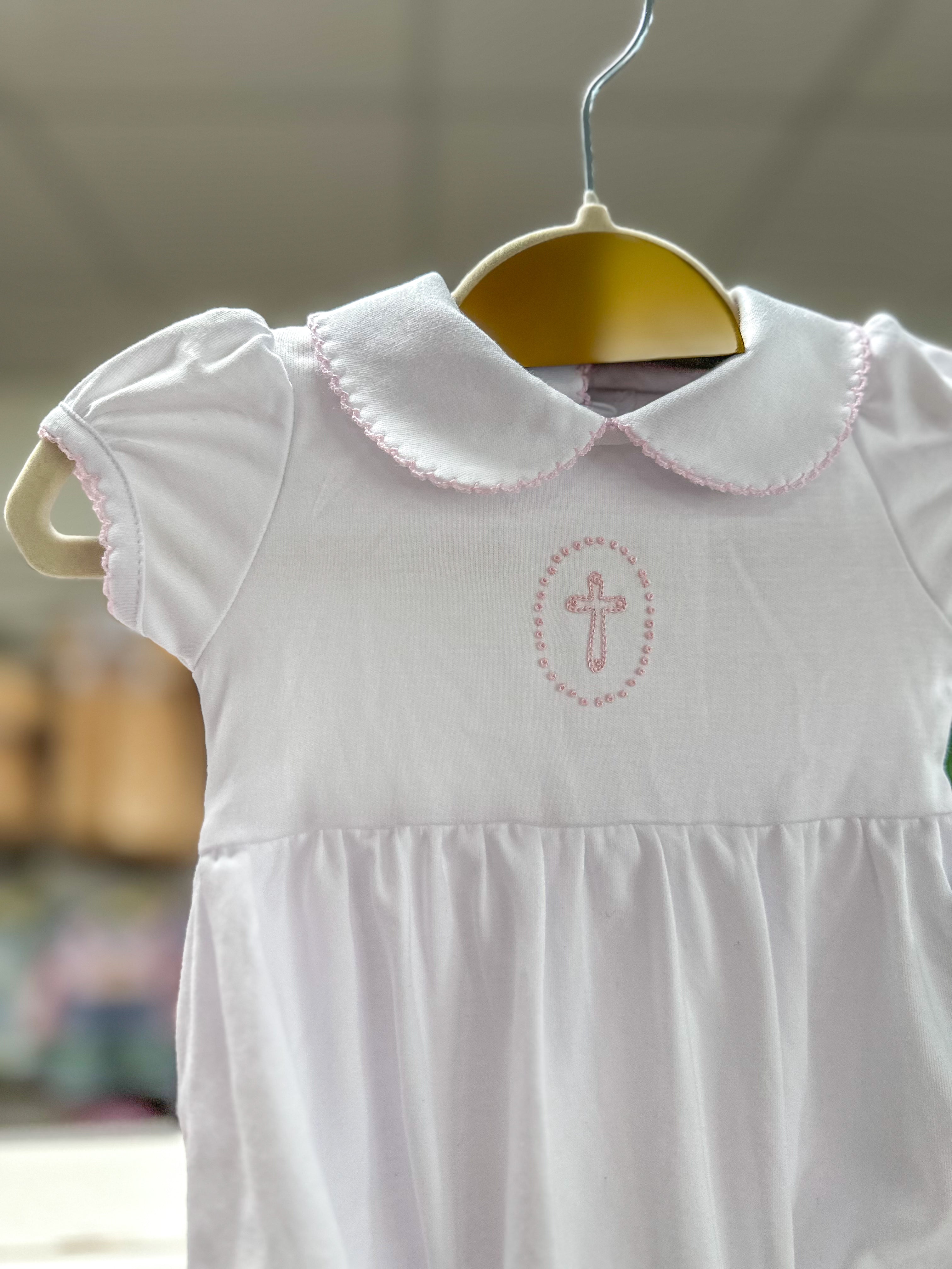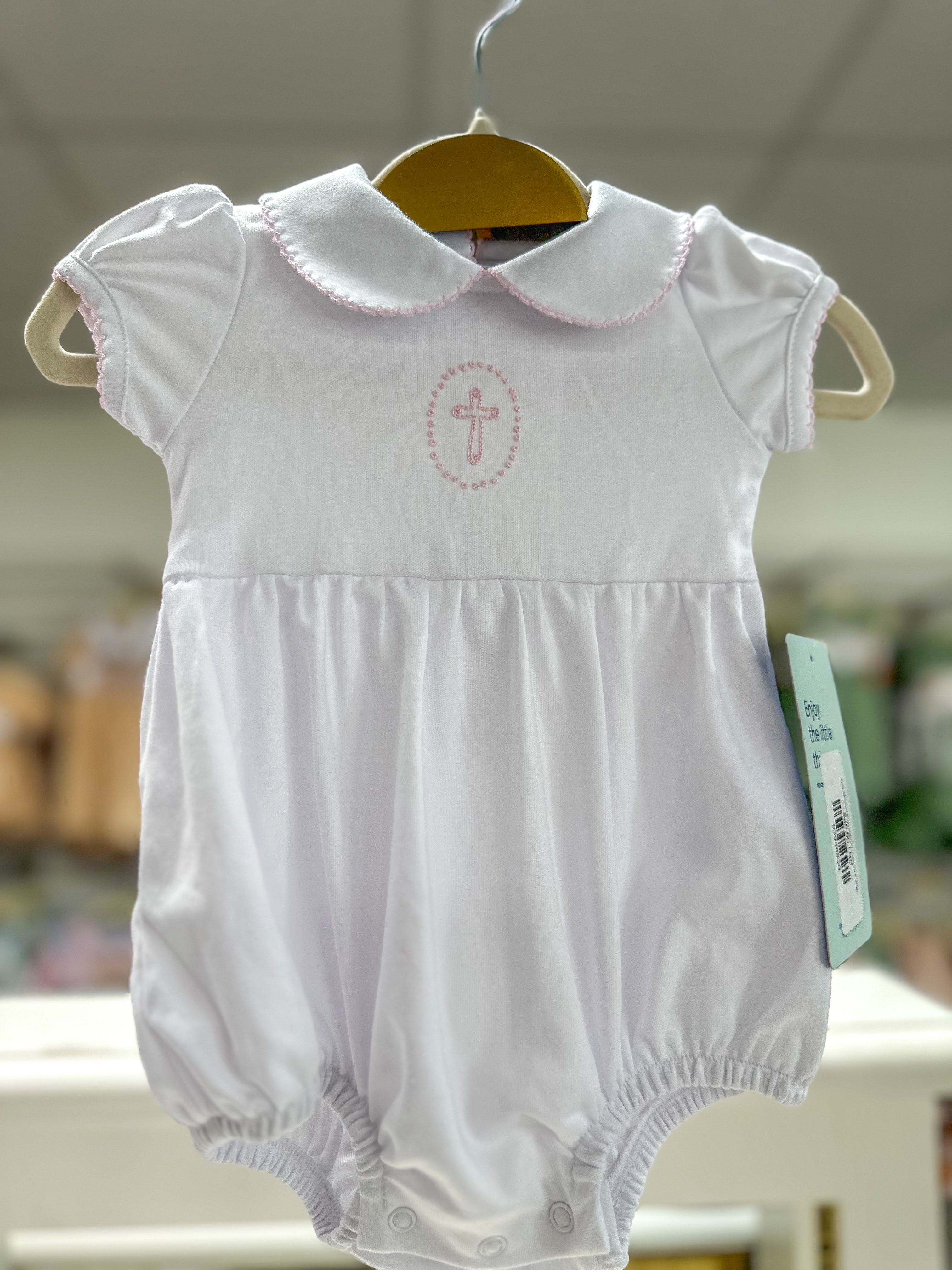 A precious choice for christenings, church, or sweet milestone moments. This classic short sleeve bubble features a crisp white base, soft blue embroidery in the shape of a cross framed by tiny dots, and a peter pan collar with matching blue trim. The gathered waist and elastic leg openings provide a timeless silhouette that’s as comfortable as it is meaningful.