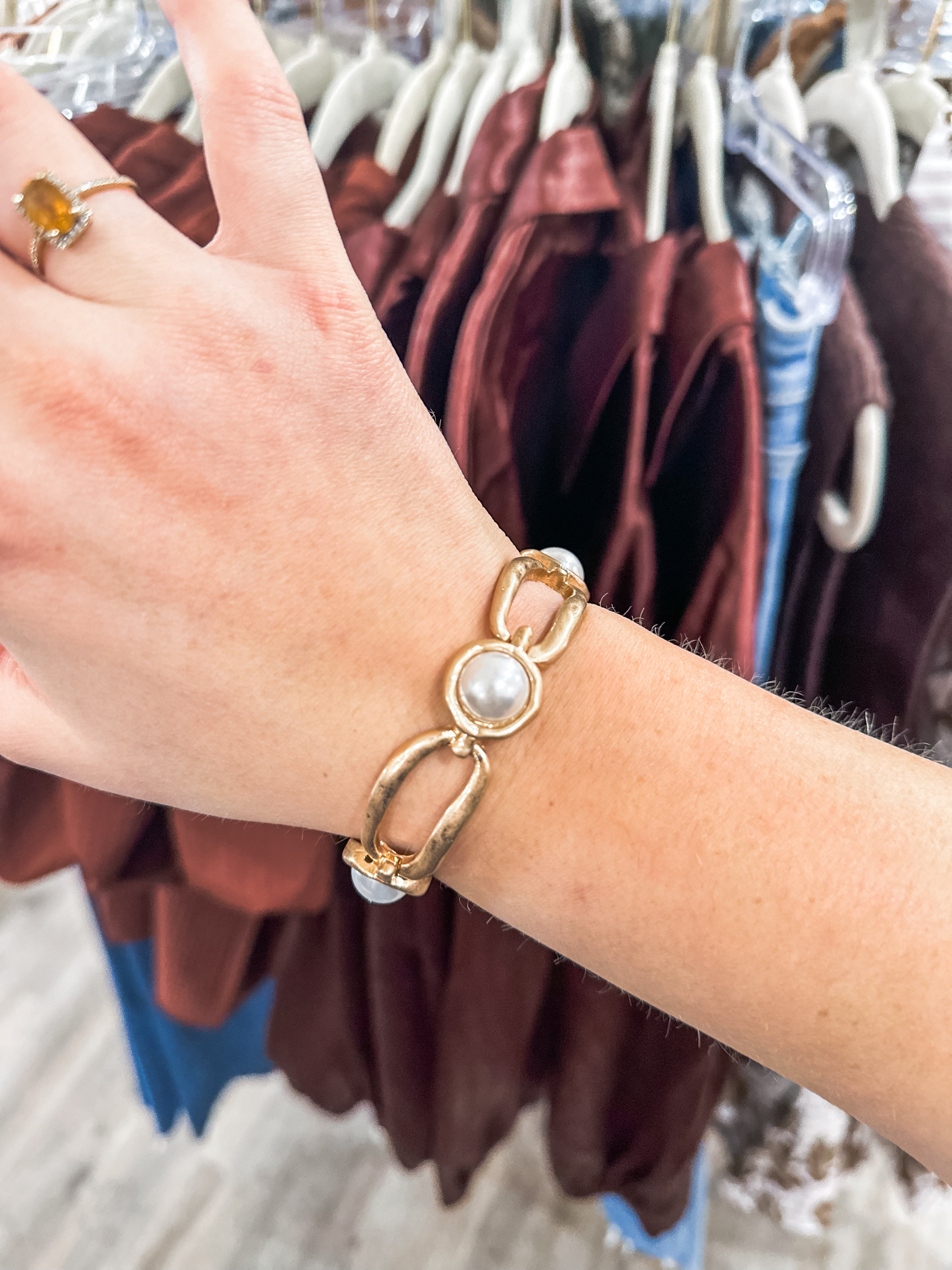 Elevated simplicity you can wear with anything. This stretch bracelet features an open gold link design accented with a dainty pearl center—timeless, lightweight, and effortlessly chic for everyday or special occasions.