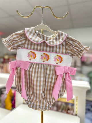 Fall Thanksgiving Apricot Plaid Turkey Embroidery Smocking Boys Romper