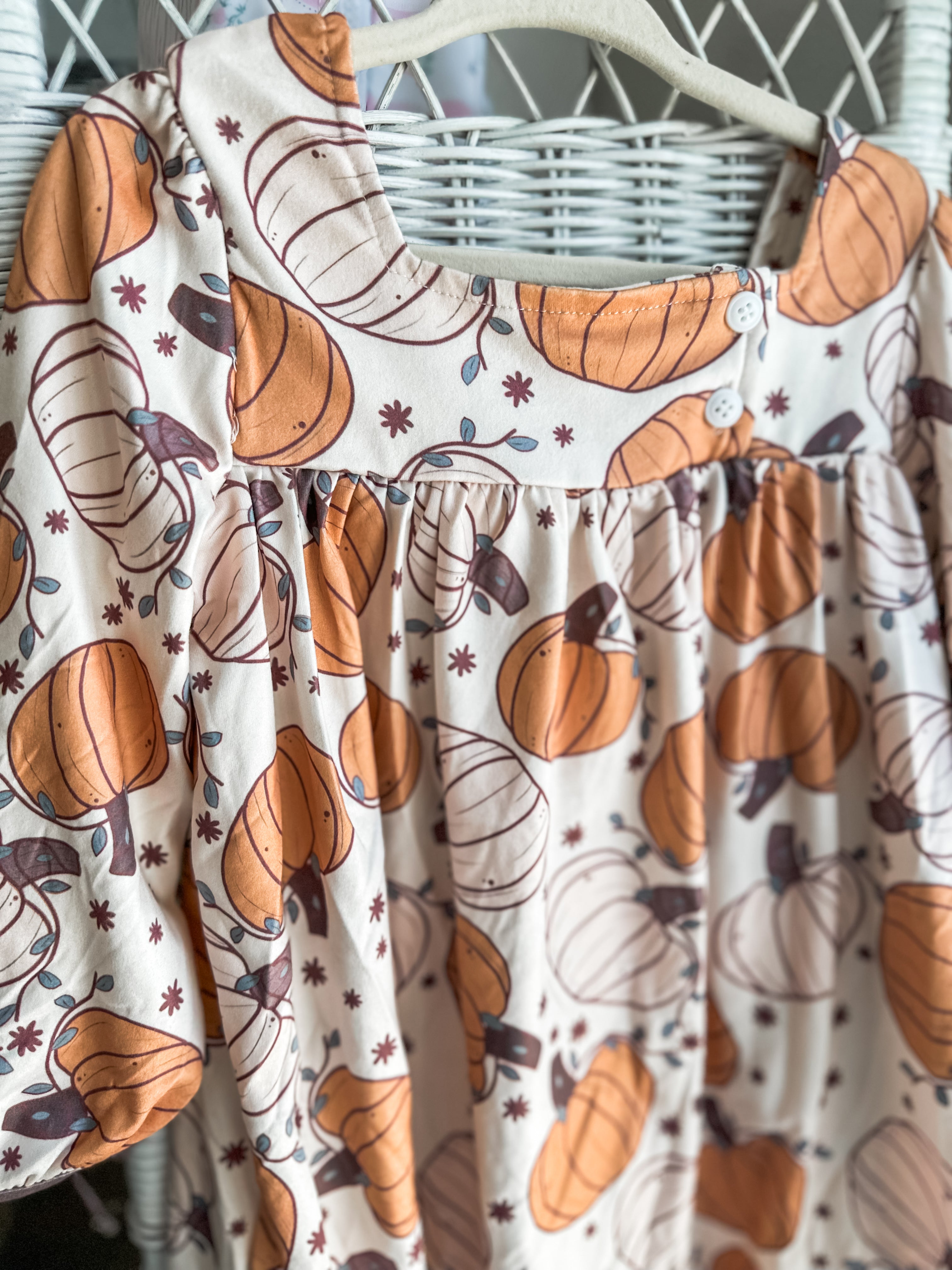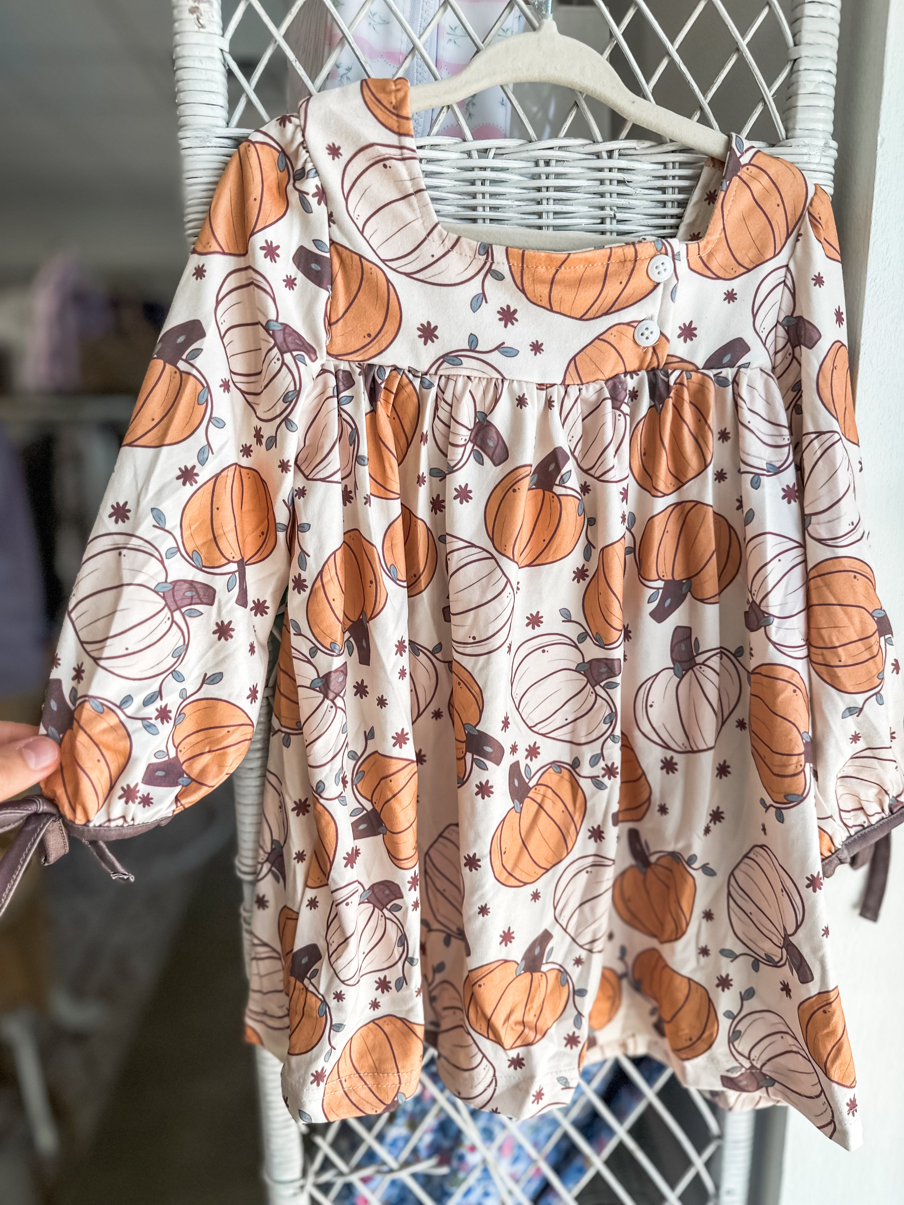 Made for fall days and pumpkin patch adventures, this sweet empire-waist dress is full of seasonal charm. The playful pumpkin print and flowy silhouette make it perfect for twirling, while the soft, stretchy fabric keeps your little one comfy all day. Ideal for fall festivals, family photos, or Thanksgiving gatherings.