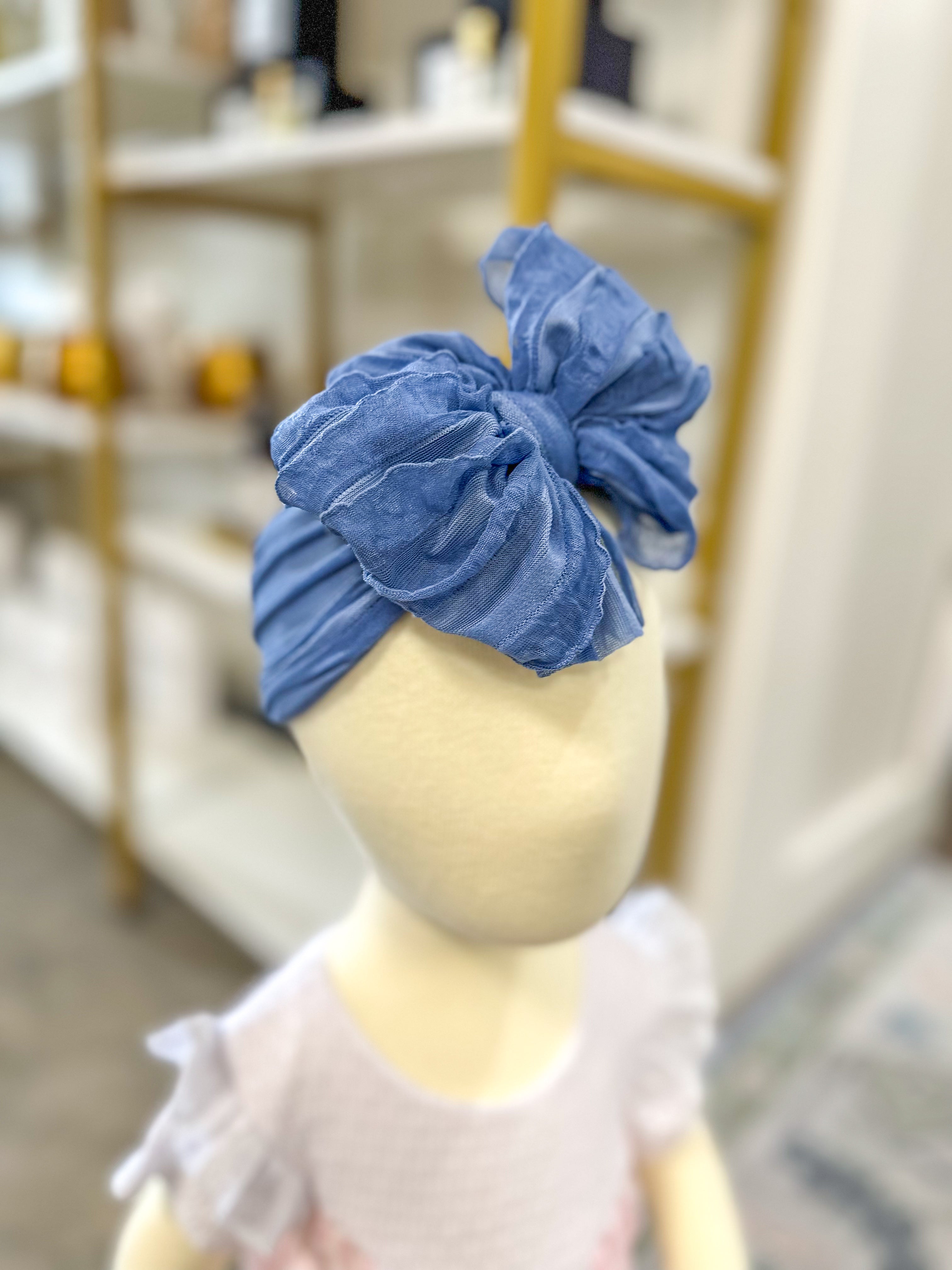 Crafted in a soft denim-blue knit, this stretchy headband is topped with a frilly ruffle bow that balances comfort with style. Designed to stay put without being too tight, it’s a must-have accessory for her wardrobe.