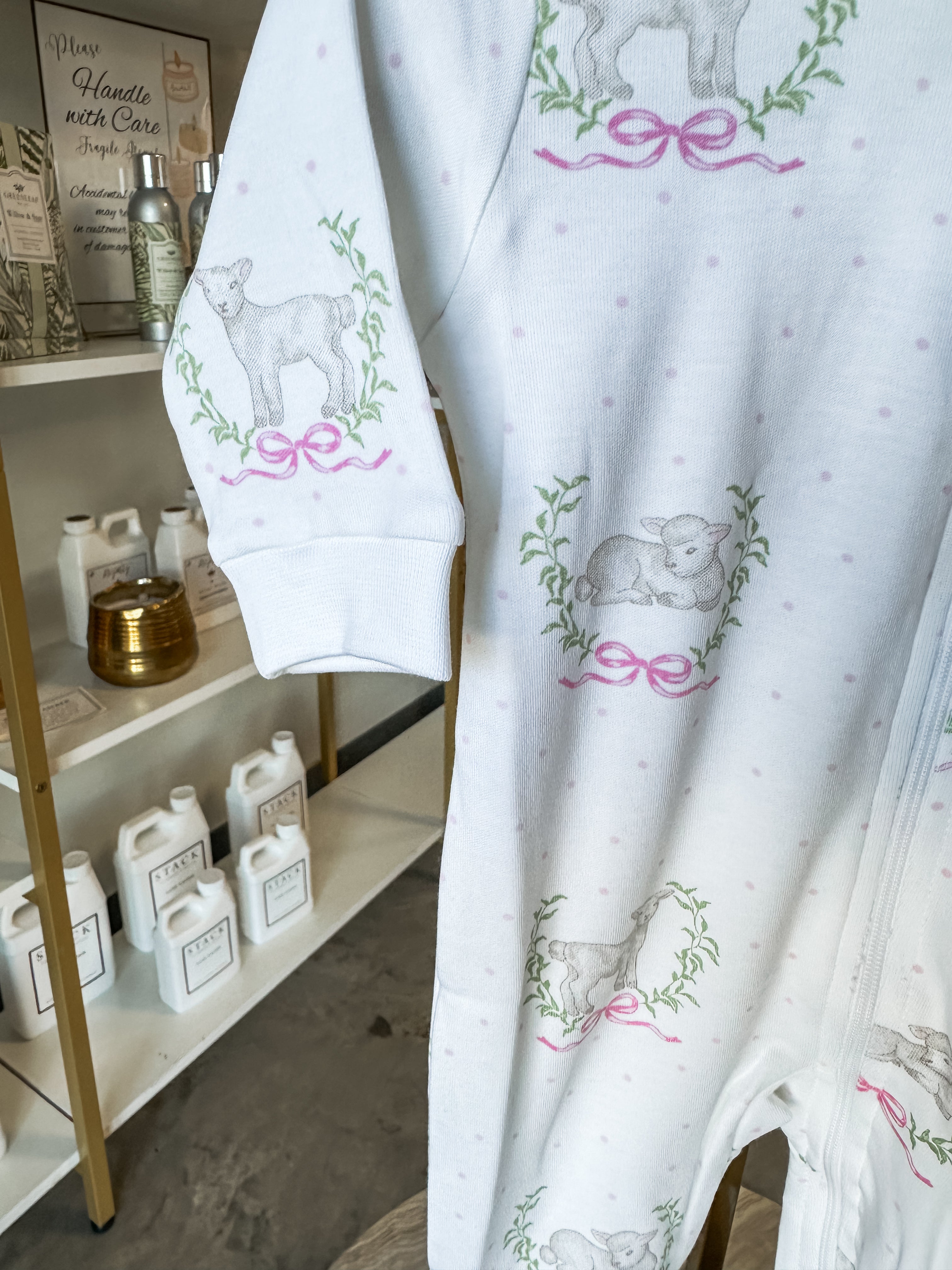 Sweet dreams start here — this lamb-print footie is as soft and cozy as it is darling. A must-have for your little one’s wardrobe or a thoughtful gift.