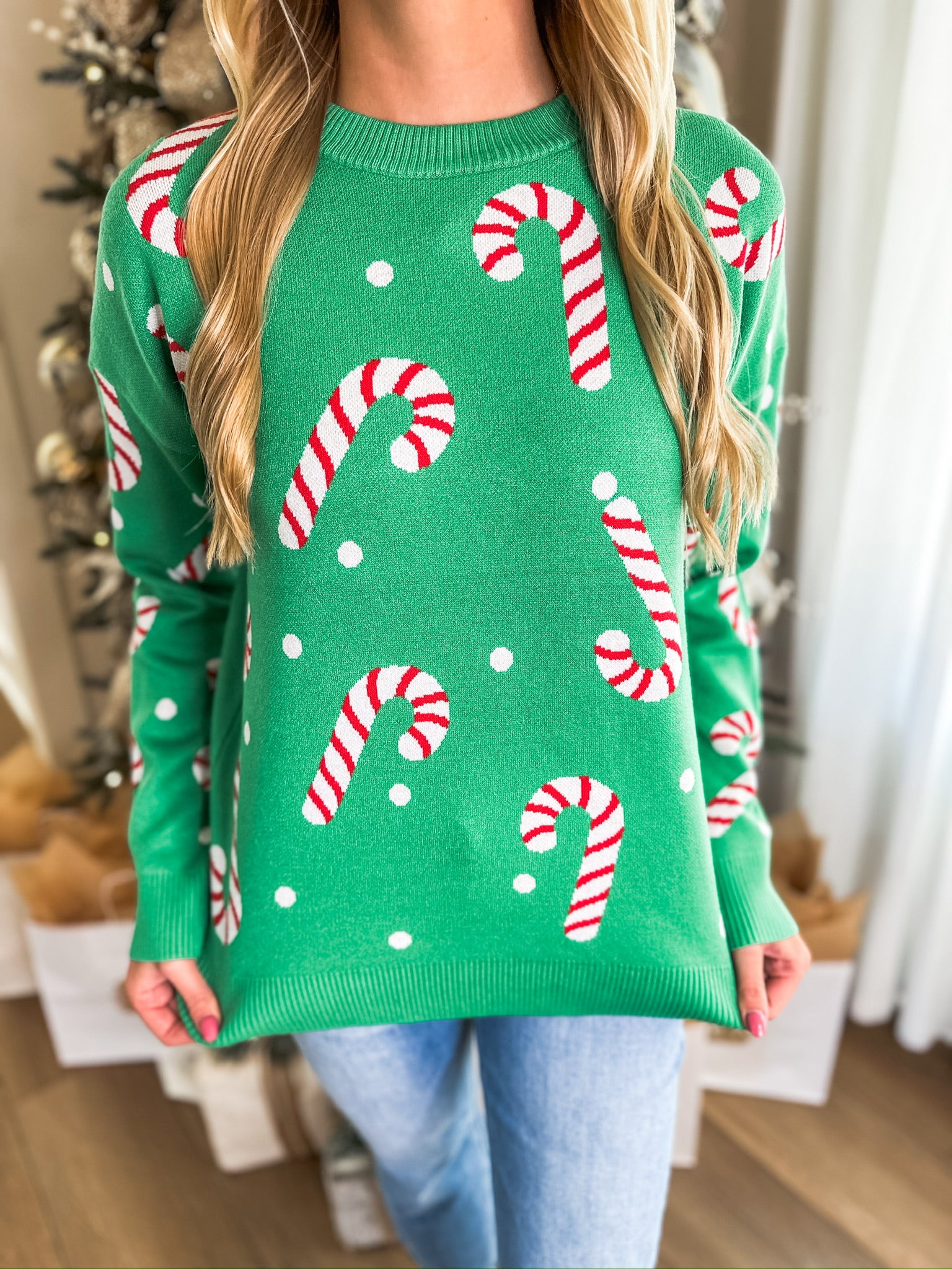 Bring on the Christmas cheer with this cozy green sweater sprinkled with candy cane magic! Festive red and white candy canes pop against the bold green knit — the perfect playful piece for holiday parties or cozy nights by the tree.