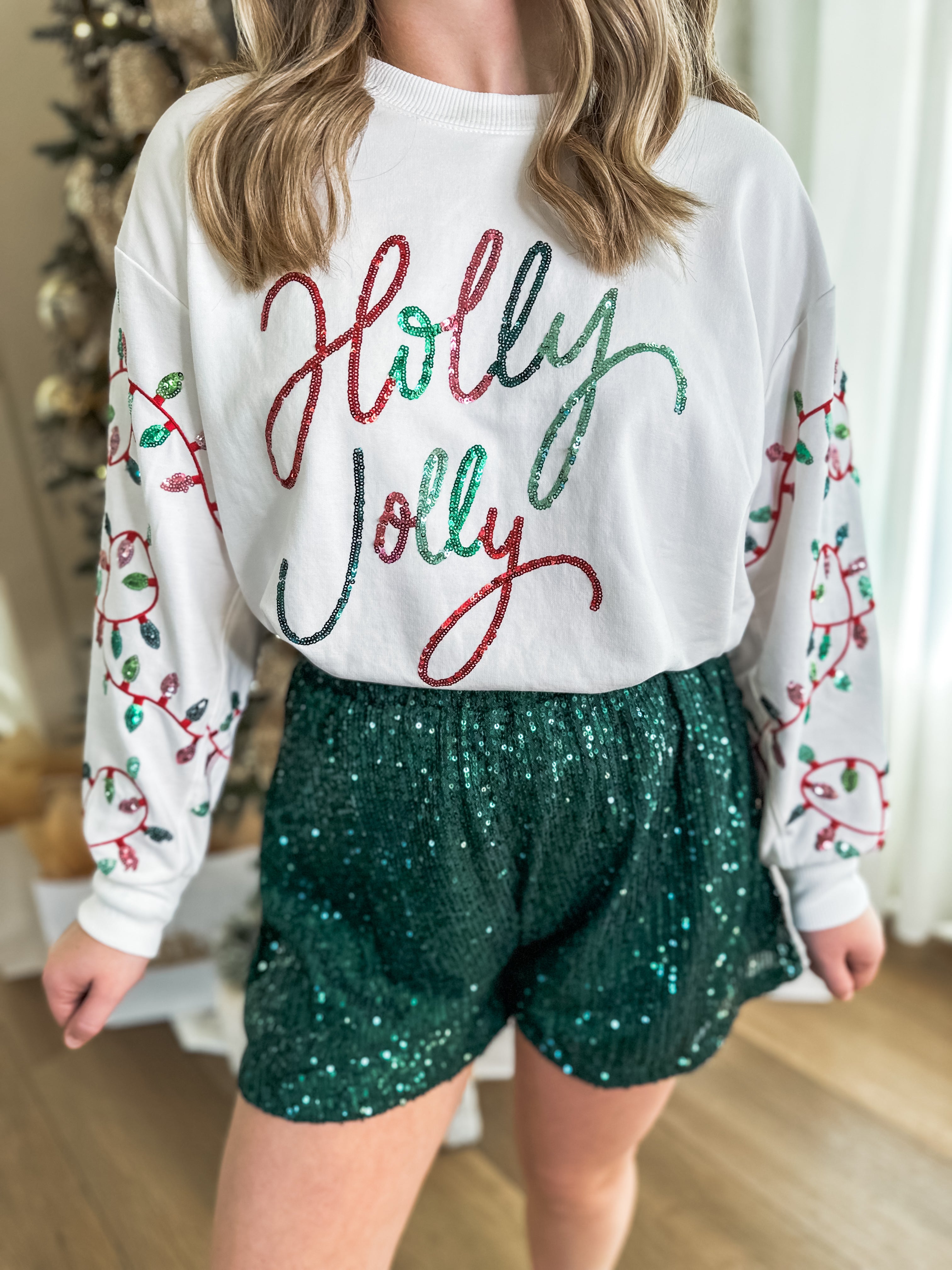 Bring on the cheer with this festive favorite! This cozy white sweatshirt features “Holly Jolly” spelled out in sparkling sequins across the front, with playful Christmas light details twinkling down the sleeves. It’s holiday happiness you can wear!
