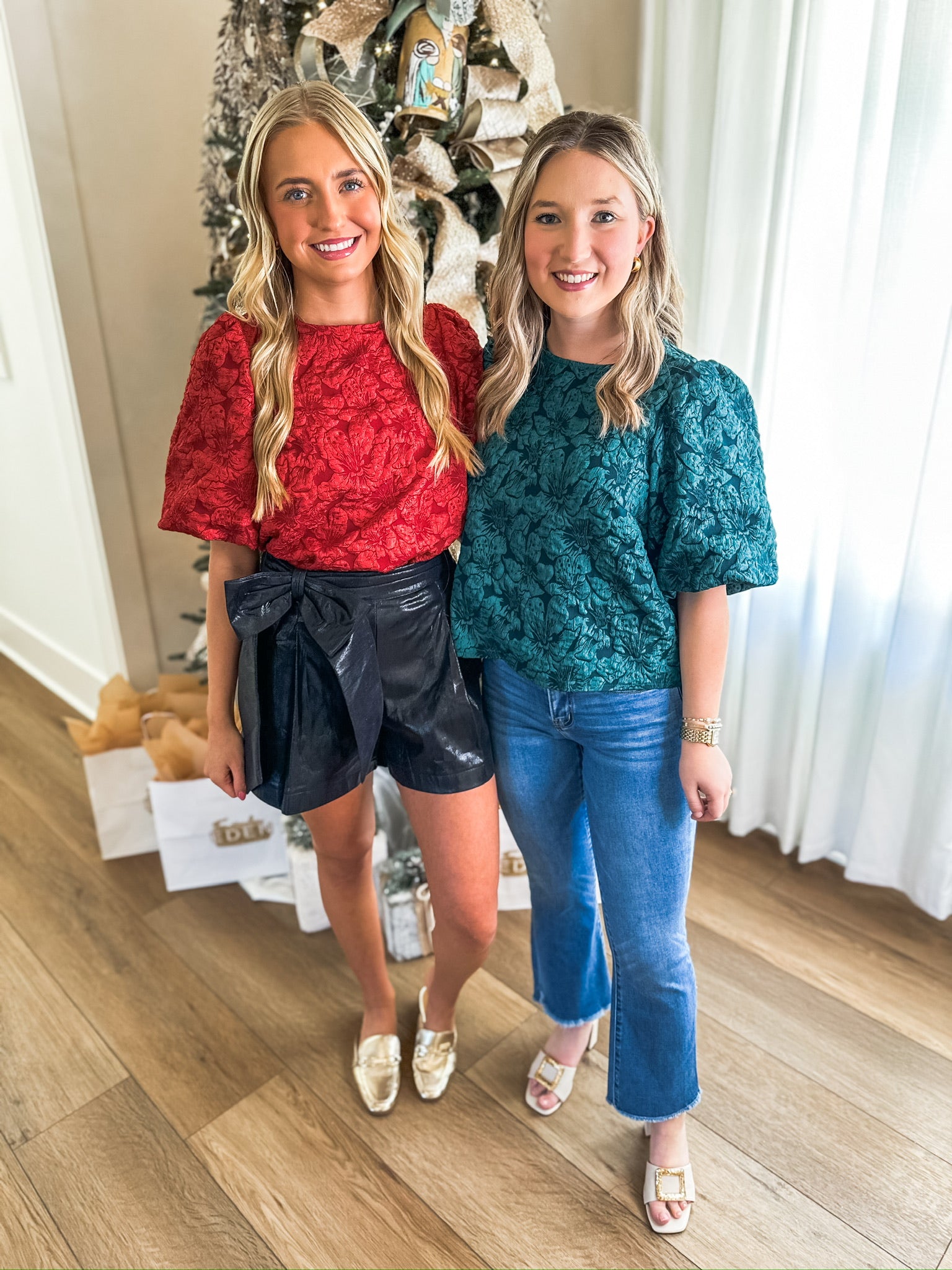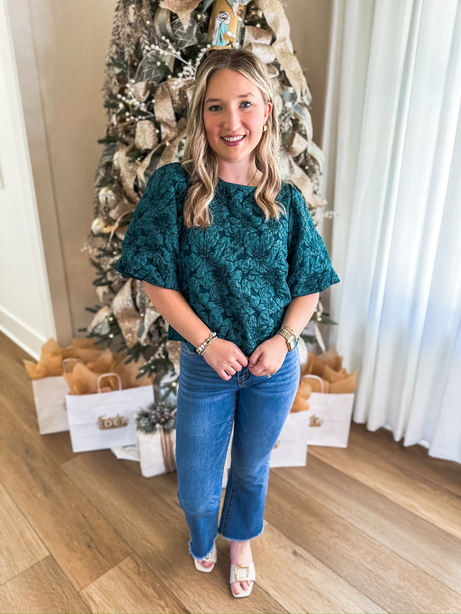 Step into chic sophistication with this textured jacquard blouse in a stunning hunter green. With puff sleeves and a bold floral pattern, this blouse is made to stand out while staying timeless. The open-back tie closure adds a touch of drama, making it perfect for everything from holiday dinners to a night out with the girls.