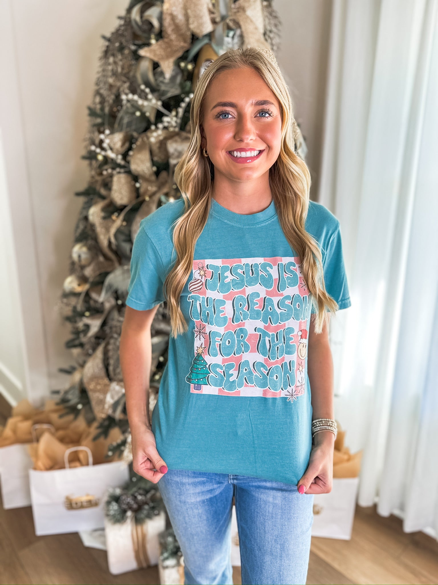 A festive reminder of what Christmas is truly about — this soft seafoam tee is perfect for casual days, gift wrapping, or Sunday gatherings.