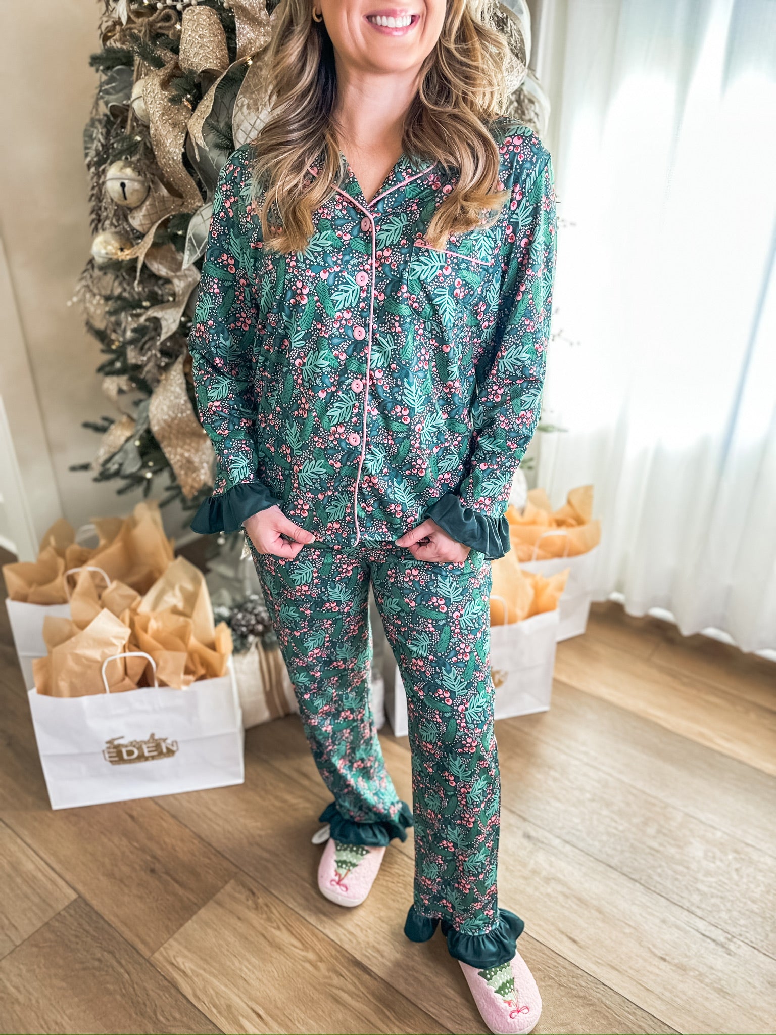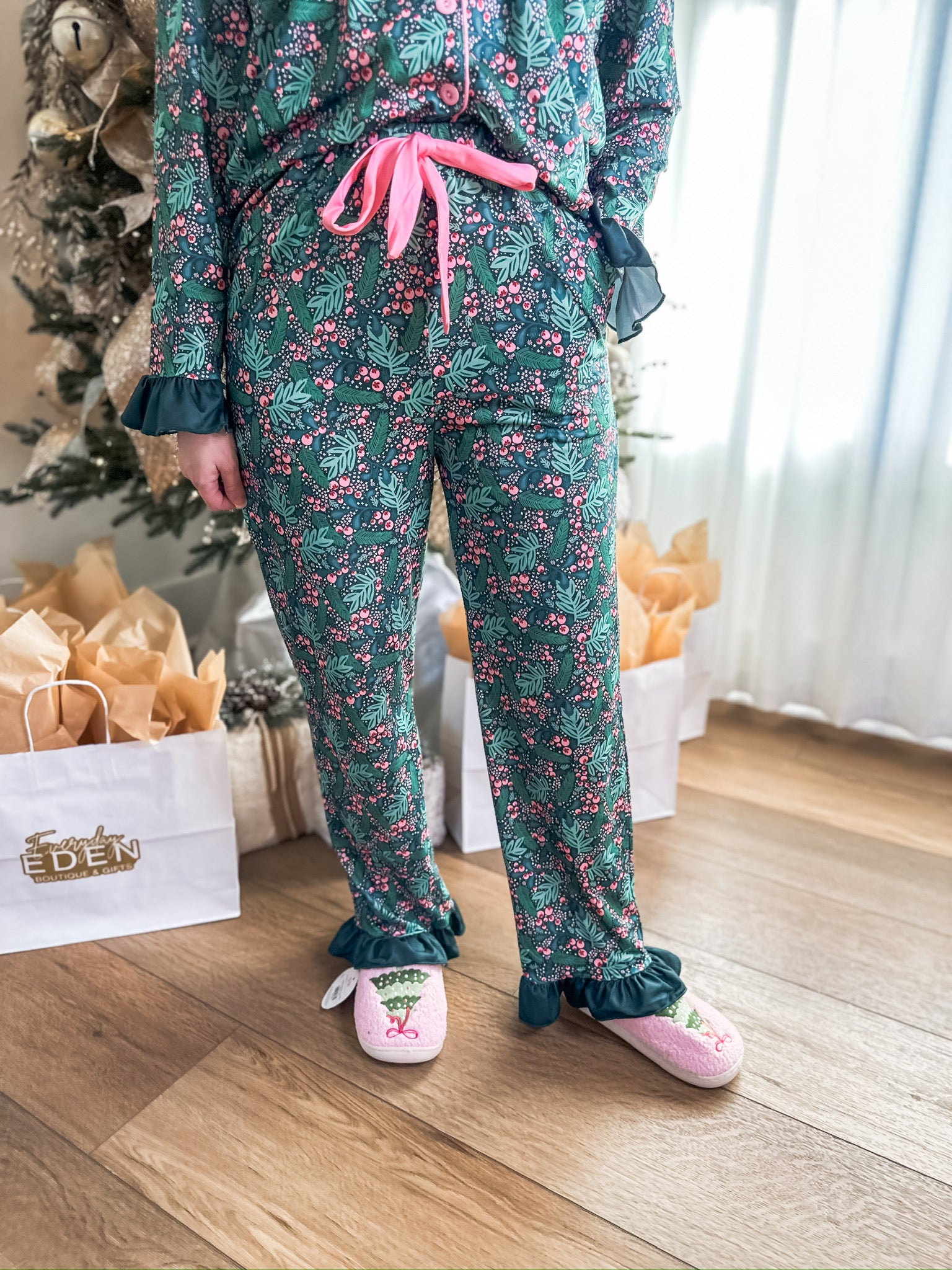 Get ready to sleigh your sleepwear game with this Holly Berry Satin PJ Set! Featuring a luxe satin feel and festive greenery print with pops of pink berries, this set brings cozy meets classy to your holiday mornings.