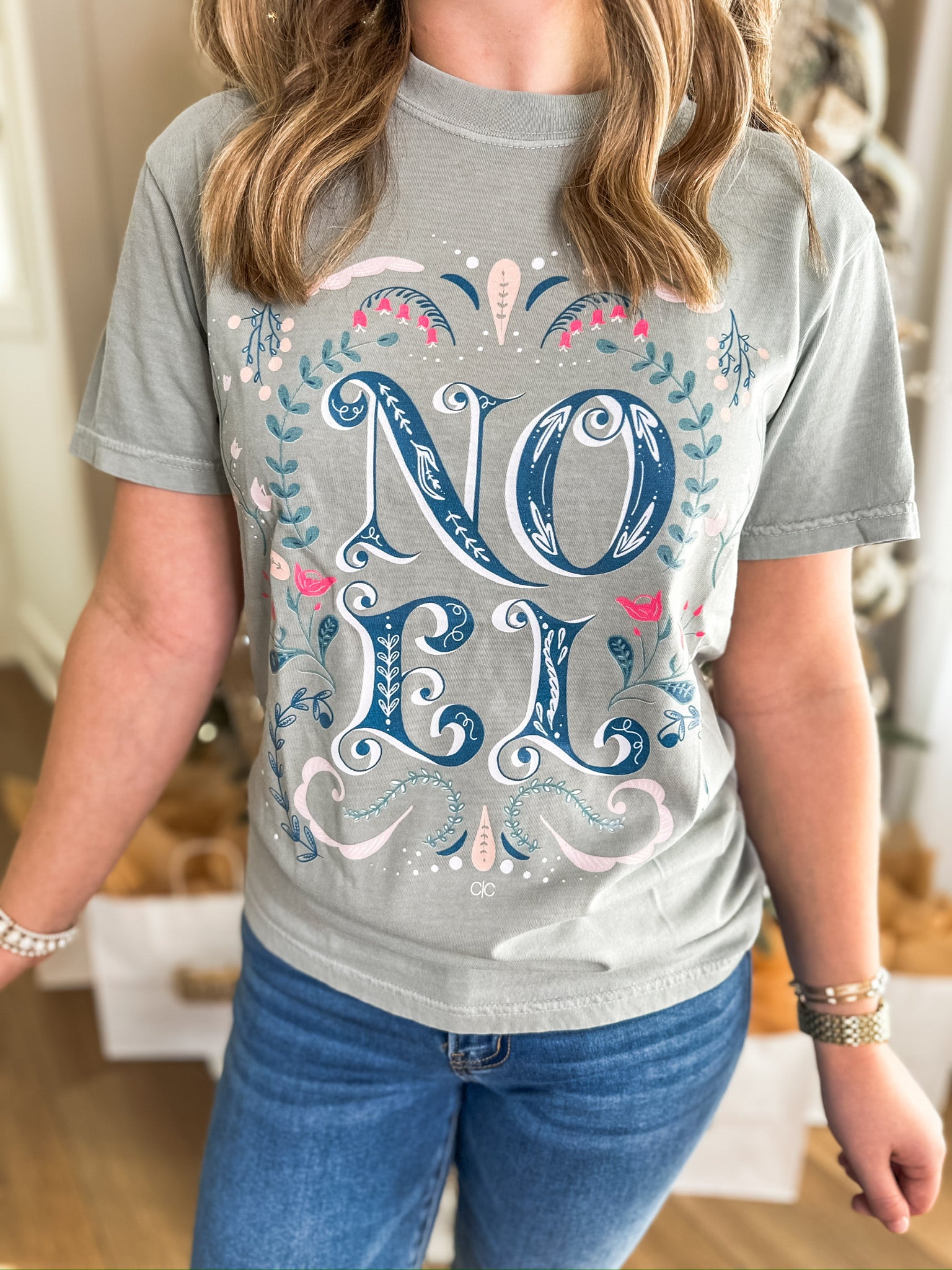 A festive favorite with a touch of vintage charm! This soft graphic tee features a blue “Noel” print surrounded by whimsical holiday accents — perfect for pairing with jeans or layering under cardigans all season long.