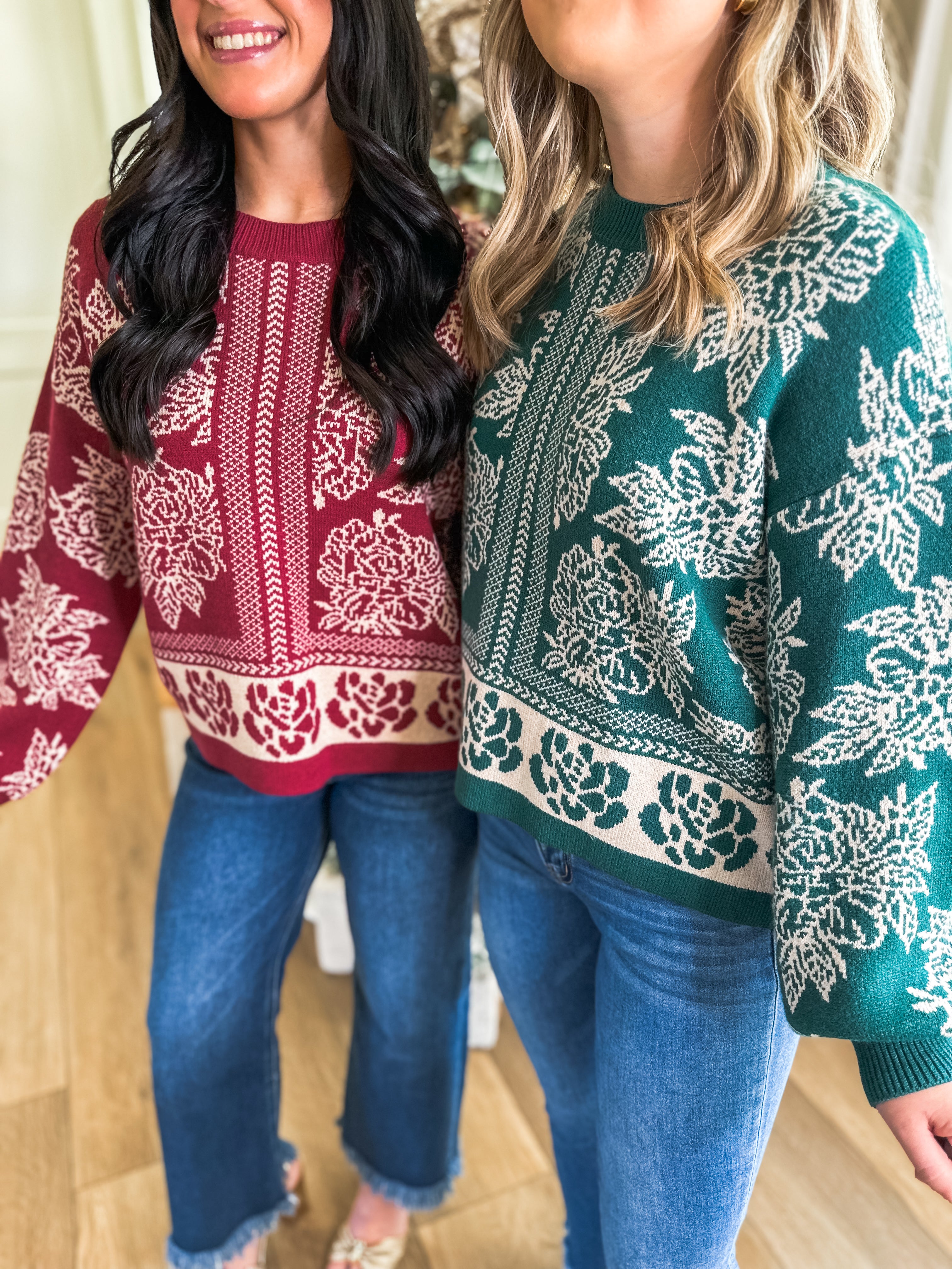 Romantic and timeless, the Pine Vintage Garden Sweater features a gorgeous cream floral knit pattern set against a rich green backdrop. The classic crew neckline and slightly relaxed fit make it a cozy yet elevated choice for cool days. Perfect with denim for casual charm or paired with a skirt for a more polished look.