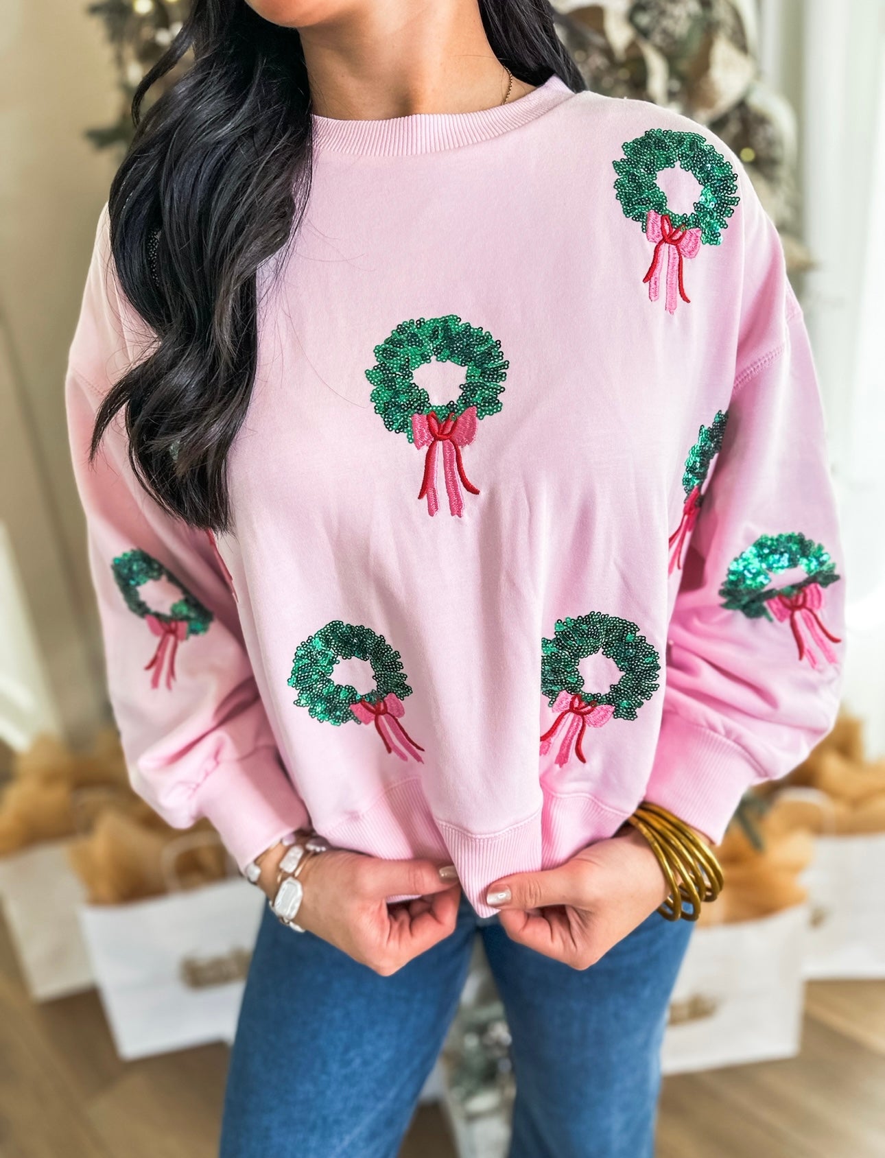 Sweet, sparkly, and perfectly festive — this pink sweatshirt is a merry must-have! Adorned with shimmering green sequin wreaths and dainty pink bows, it’s the prettiest way to stay cozy while spreading Christmas cheer.