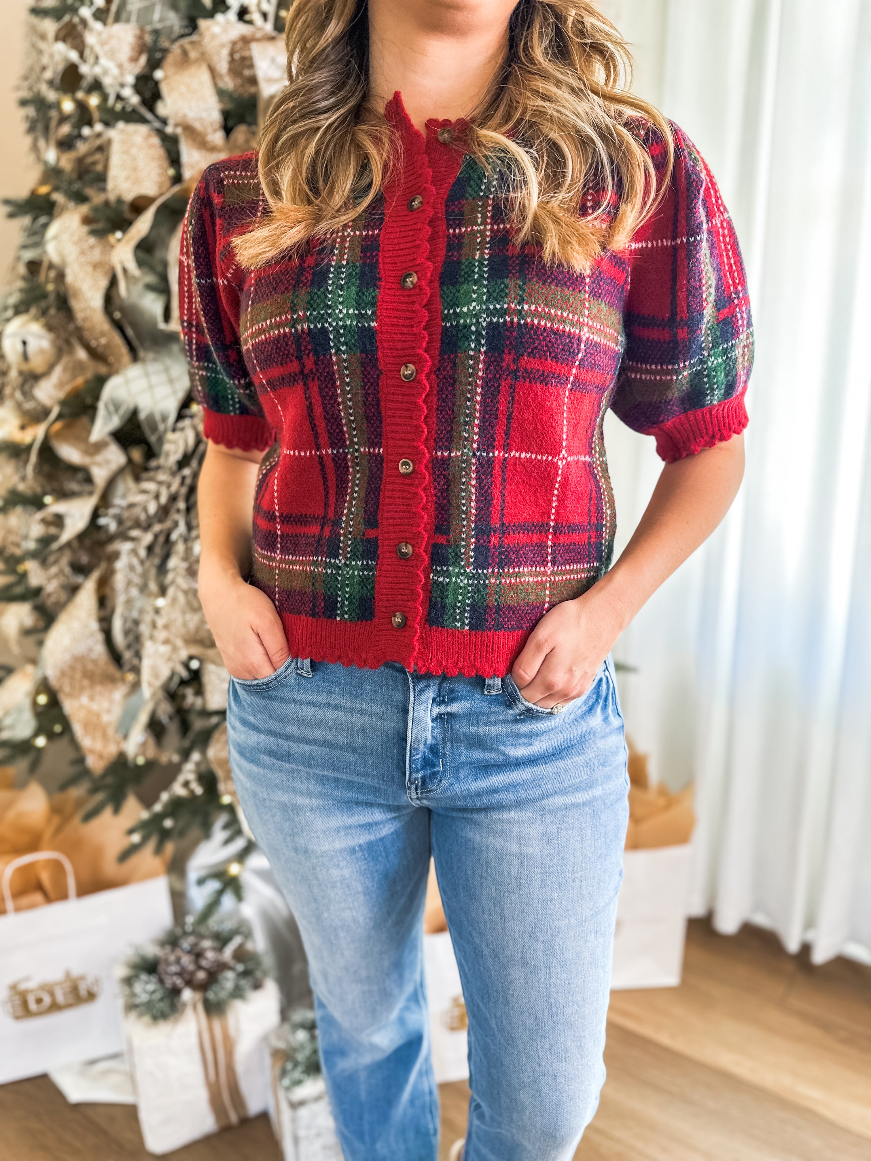 Bring on the holiday spirit with this cozy and colorful cardigan! Featuring a festive red base with green and navy plaid, dainty puff sleeves, and button-front detail — it’s the perfect blend of classic charm and cozy comfort for all your merry moments.