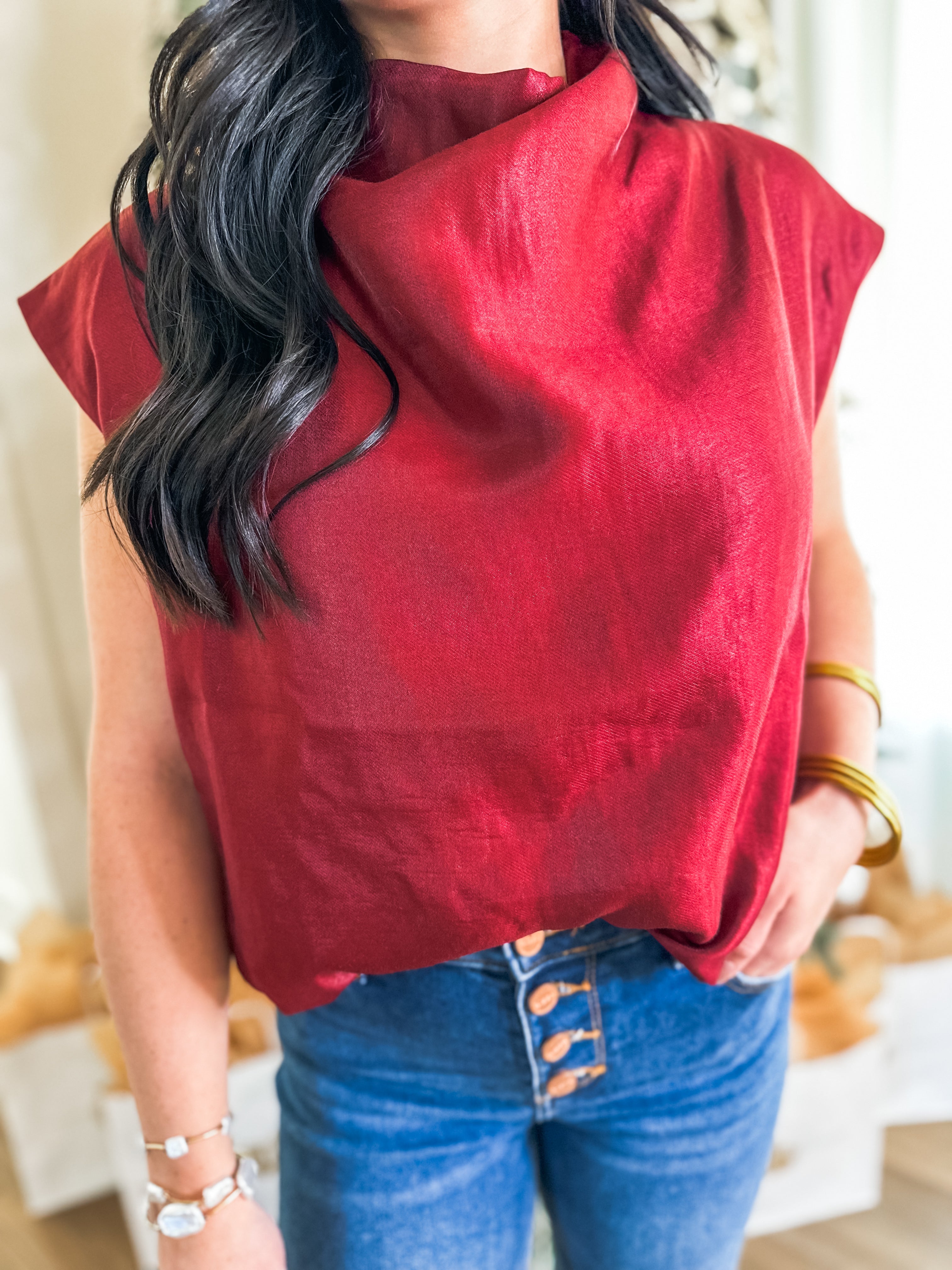 Its high neckline and flowy shape bring an elegant touch, while the bold ruby hue adds the perfect pop of color to your winter wardrobe.