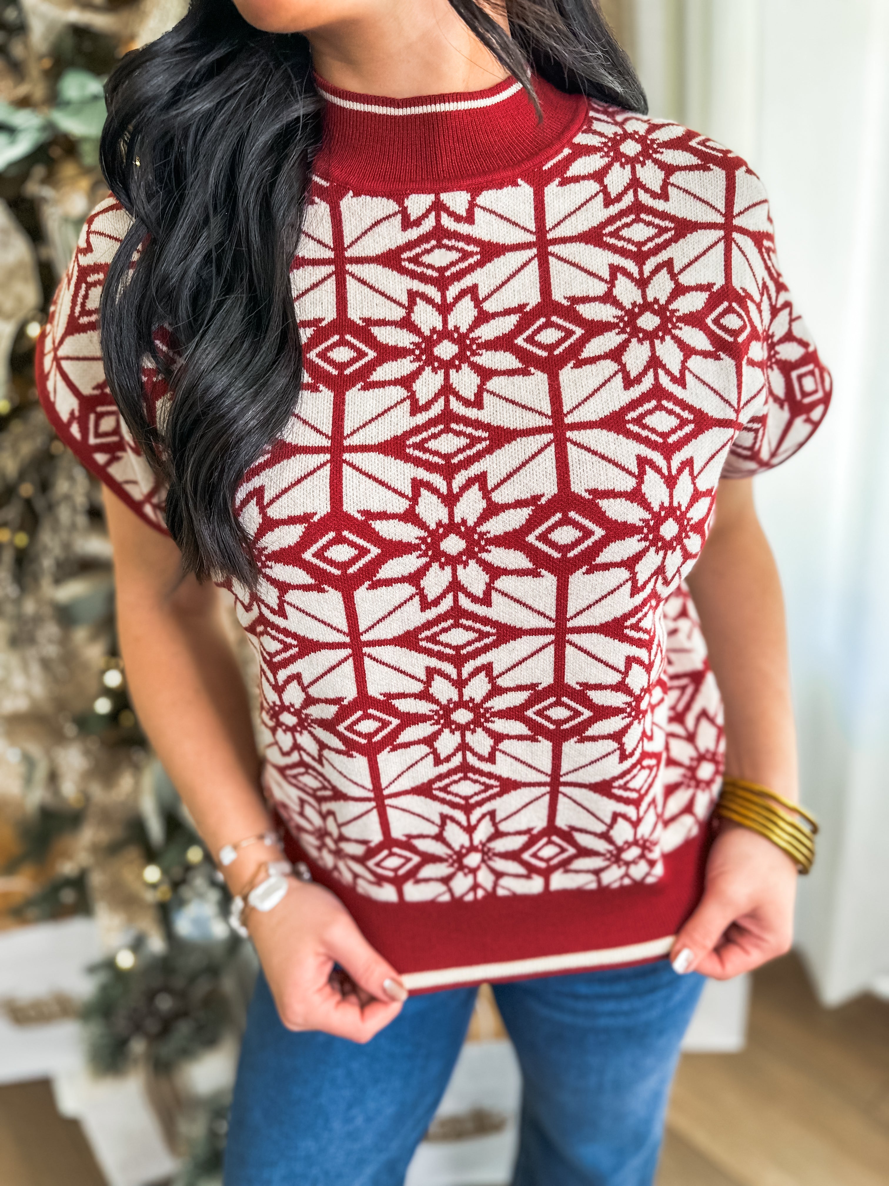 Featuring a bold geometric snowflake pattern in cream and red, this structured knit has a mock neckline, cap sleeves, and ribbed hems for a polished finish. Soft, breathable, and easy to dress up or down — just add denim, faux leather, or a pleated skirt.