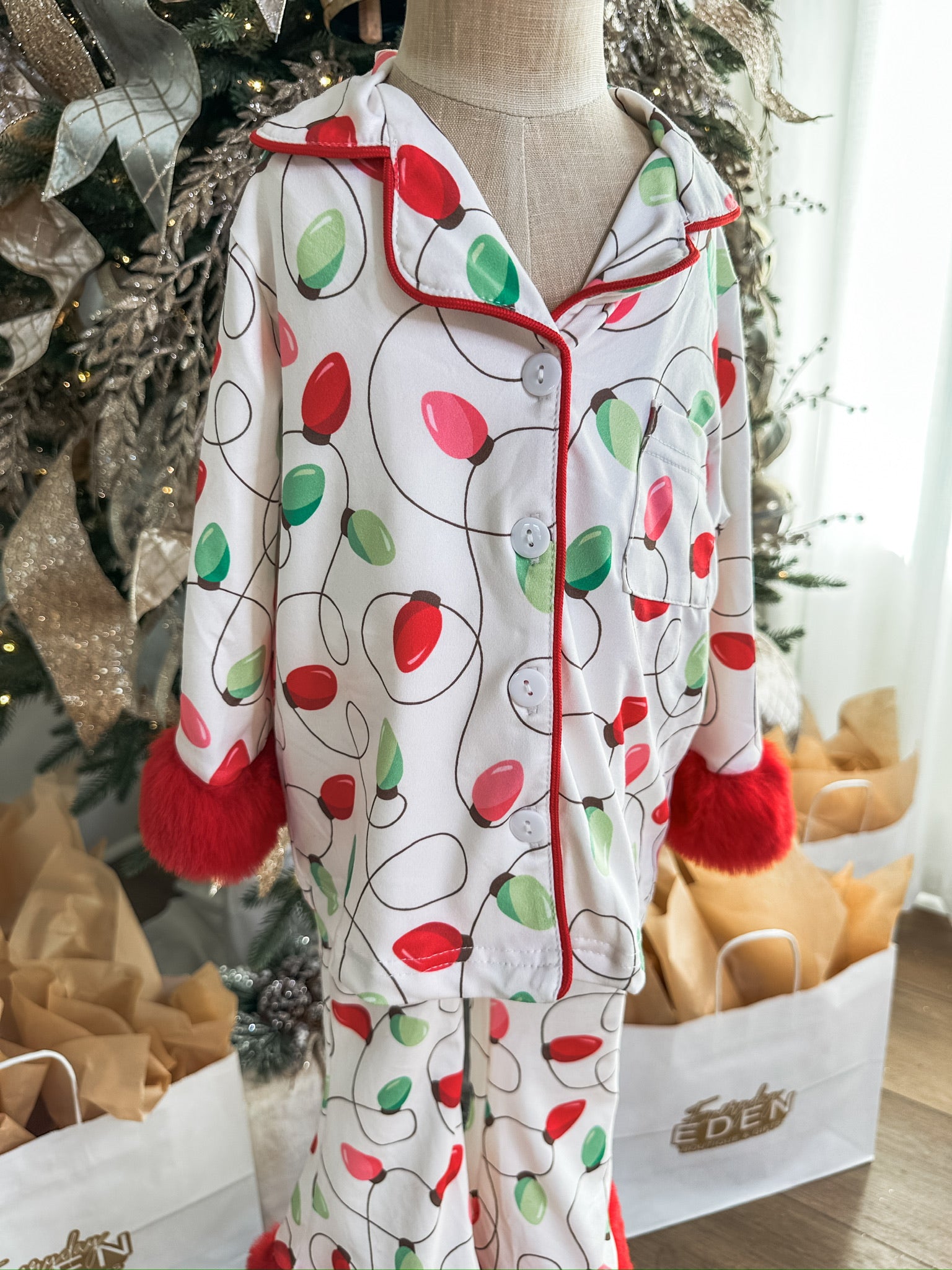 This festive pajama set features a whimsical Christmas lights print trimmed with red piping and fuzzy cuffs for the coziest holiday touch. Perfect for matching sibling sets, movie nights, and those magical Christmas morning photos!