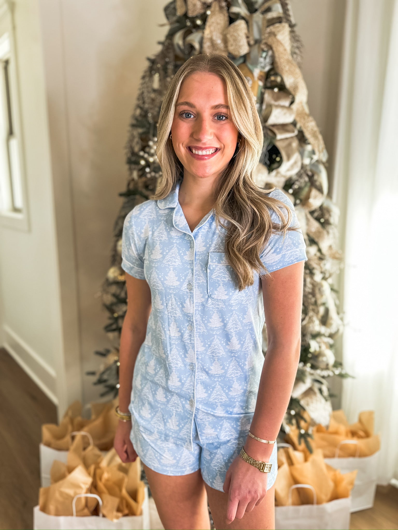 Drift into the coziest winter nights with this soft pajama short set. Featuring a frosty blue holiday print, it’s perfect for lounging, gifting, or sipping cocoa by the tree.