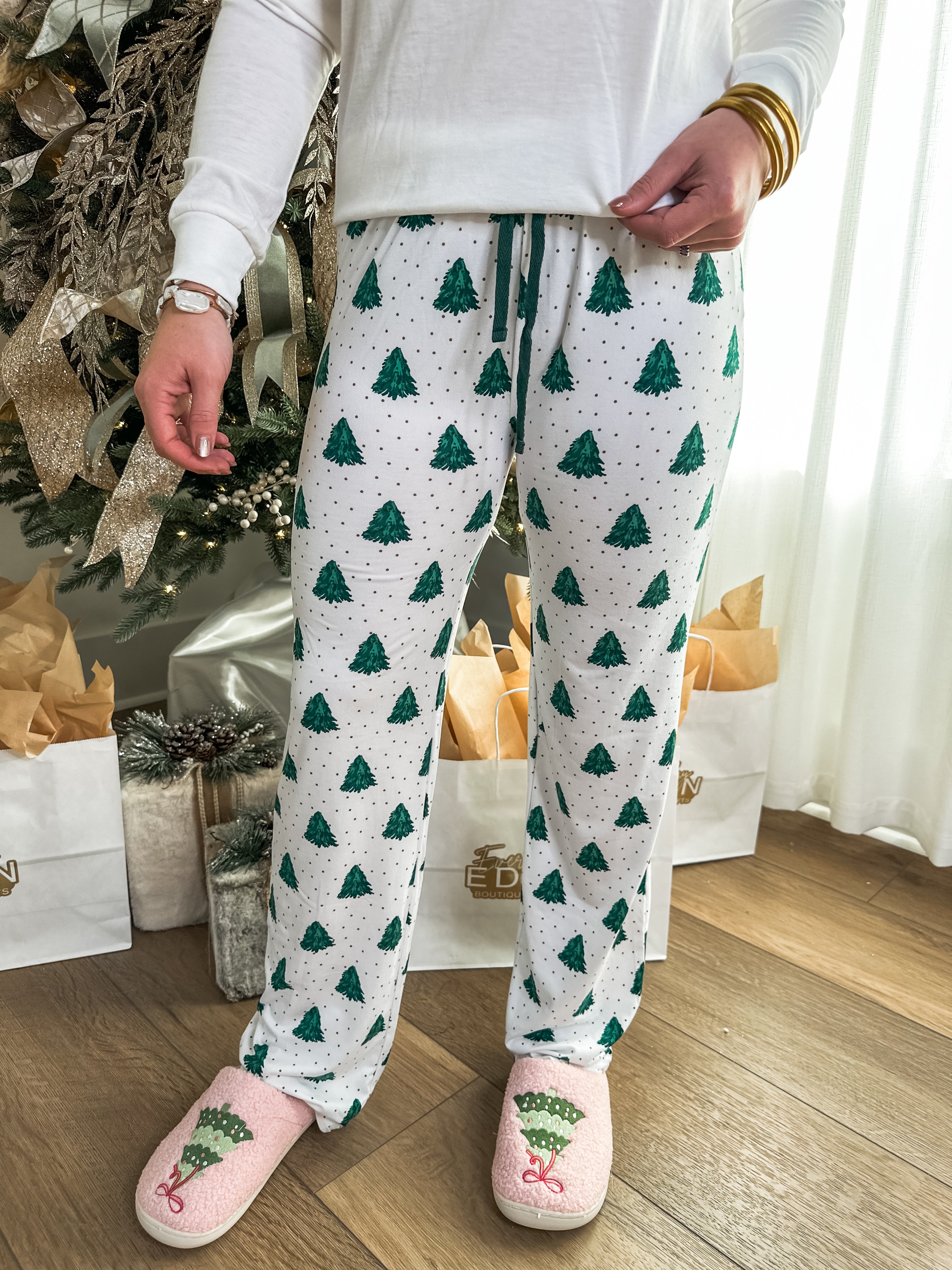 Dream of twinkling lights and cozy nights in these festive Noble Fir Pajama Pants! With a charming evergreen tree print on a soft white base, they’re made for holiday lounging, movie marathons, and matching family moments.