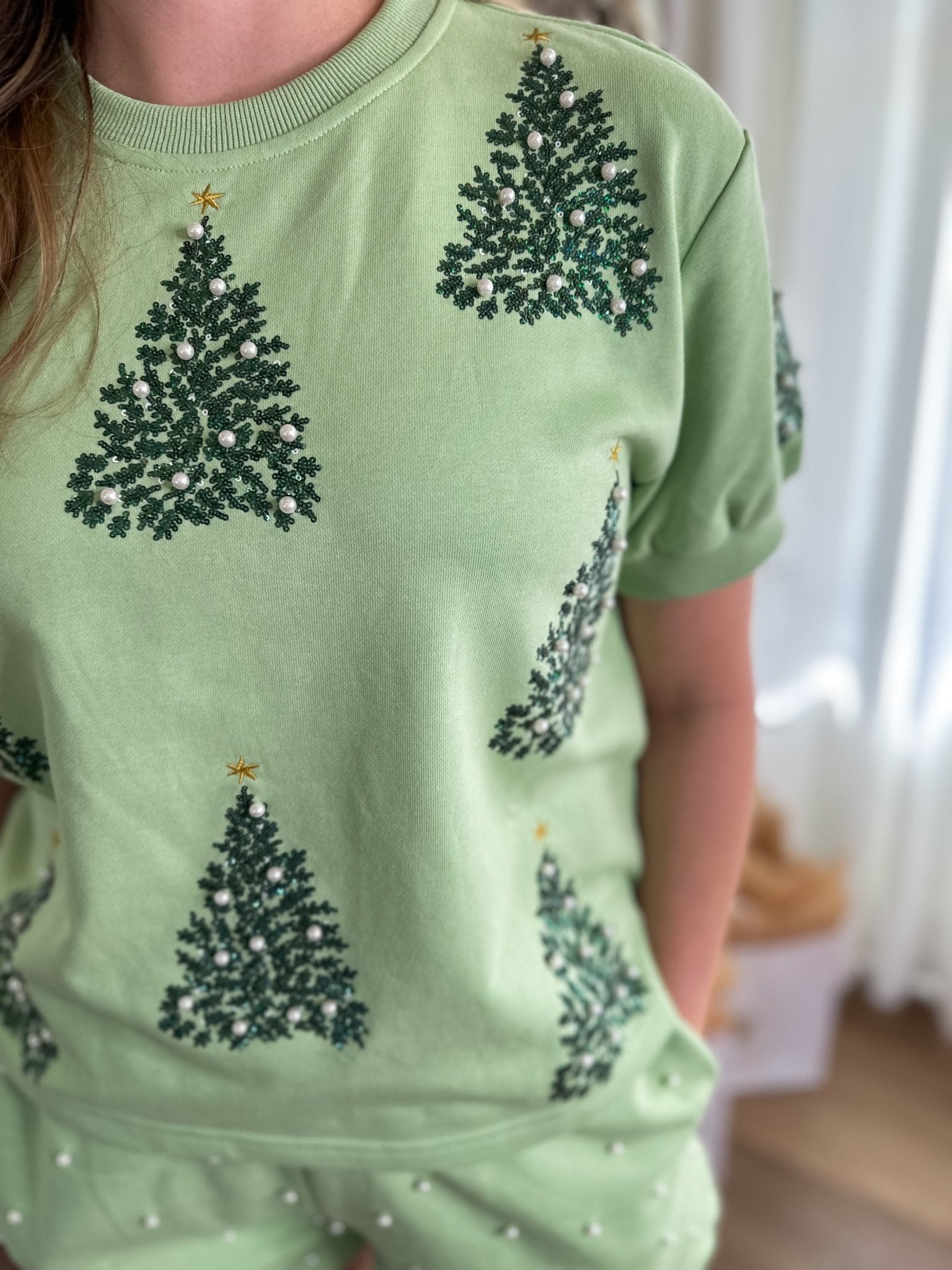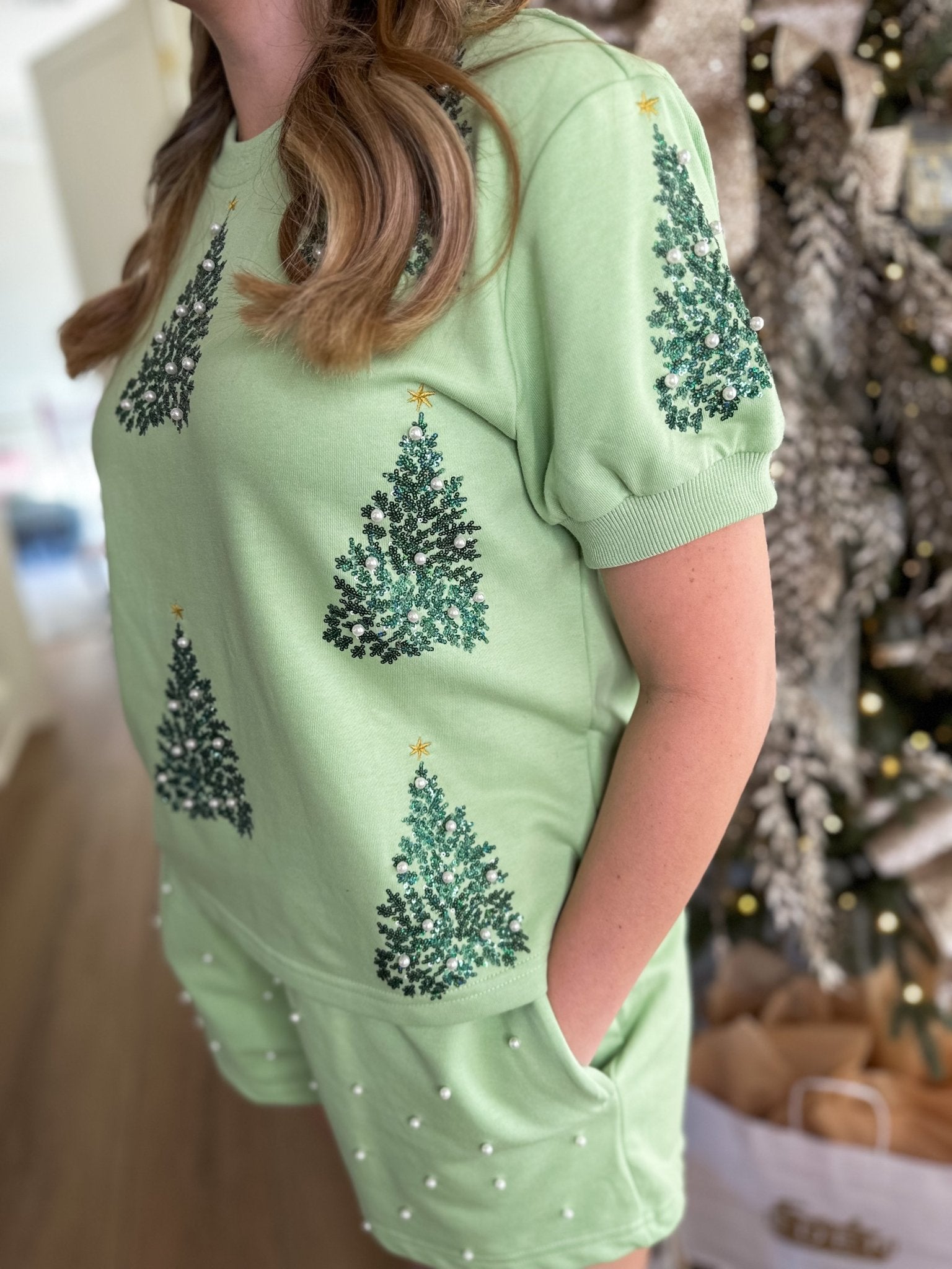 This festive short set blends the comfort of a sweatshirt with just the right amount of sparkle and classic elegance. The top features a relaxed crewneck fit with slight puff sleeves and shimmering sequin Christmas trees adorned with pearl accents. The matching shorts continue the look with pearl embellishments throughout, creating a coordinated set that’s both merry and chic.