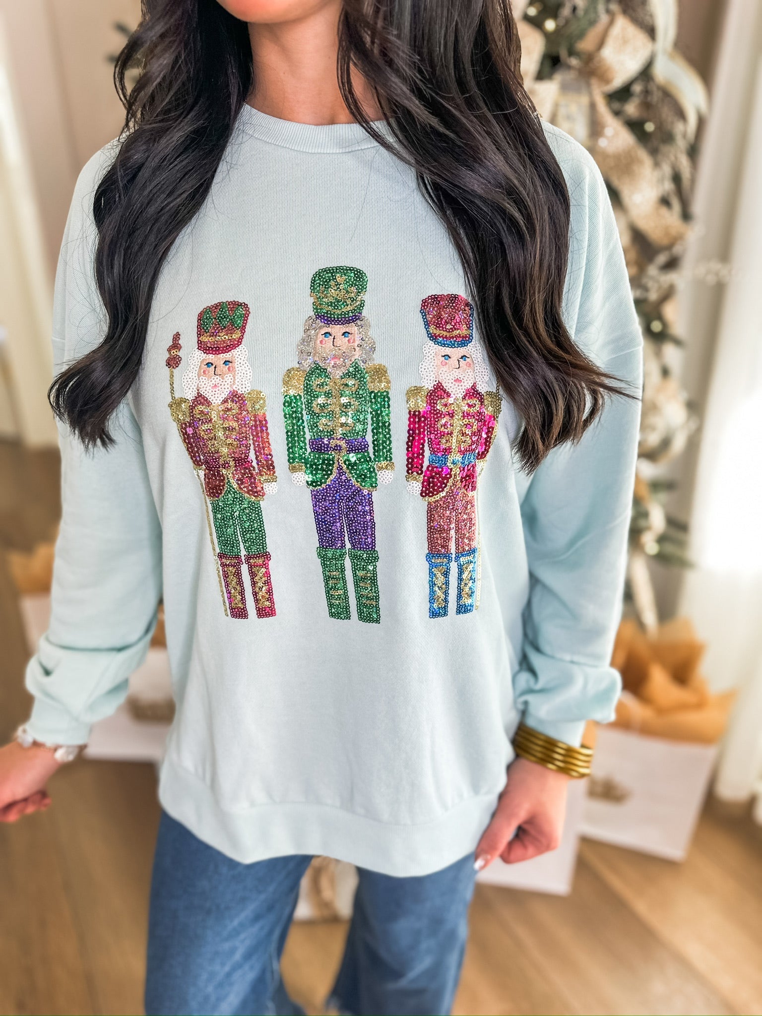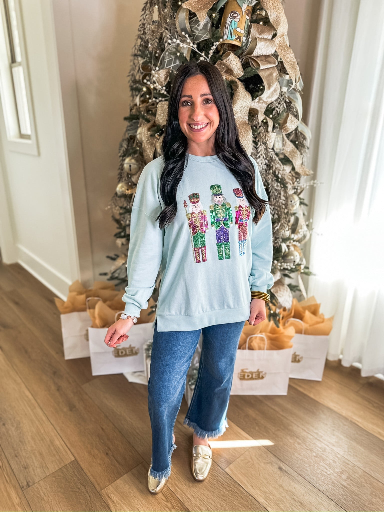 - Soft powder blue sweatshirt with sequin nutcracker design