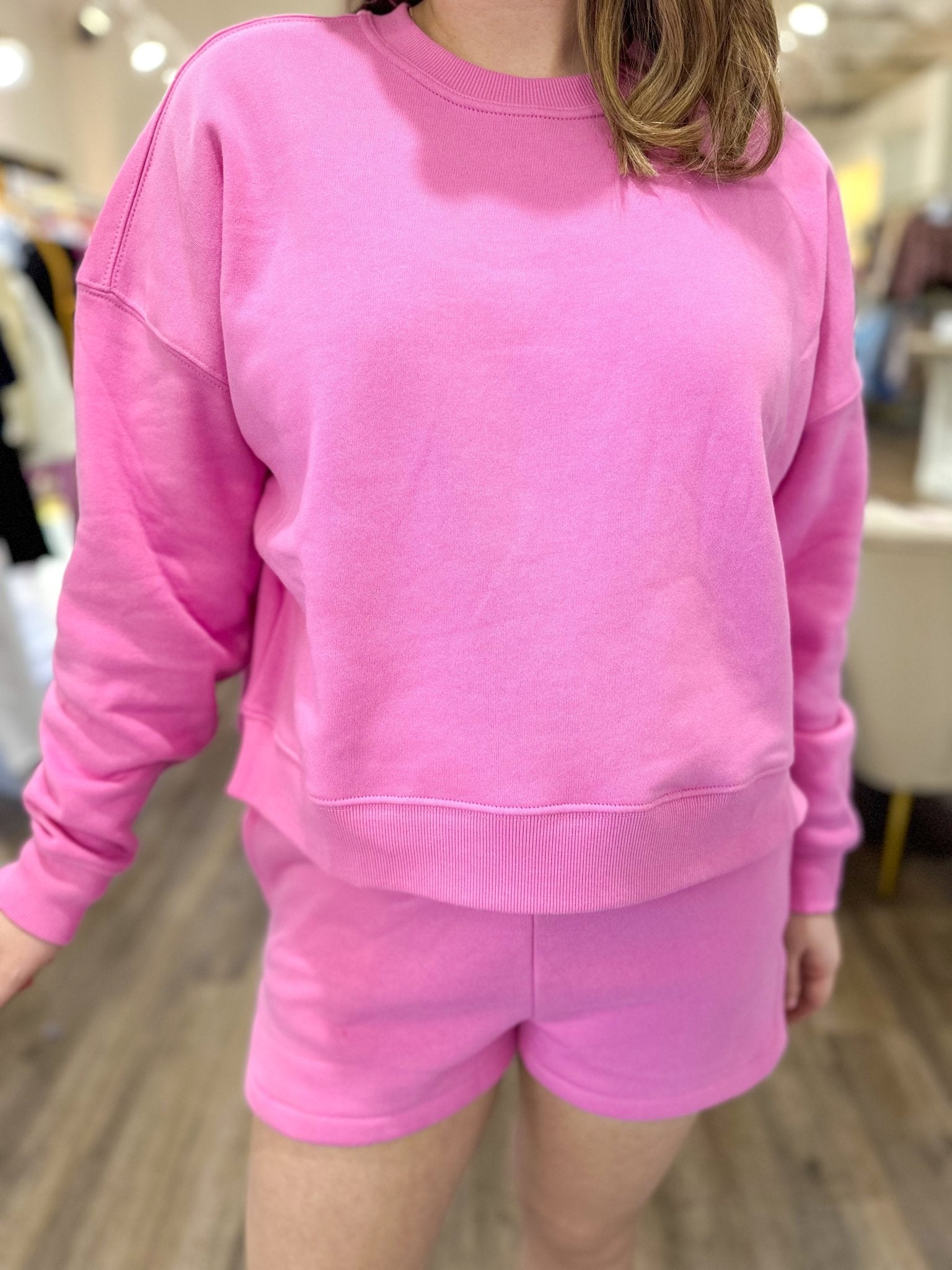 The ultimate comfy-cute set you’ll want to live in. This candy pink fleece set features a relaxed long sleeve sweatshirt paired with matching pull-on shorts for an effortlessly coordinated look. Soft, cozy, and perfect for lounging, errands, or travel days.