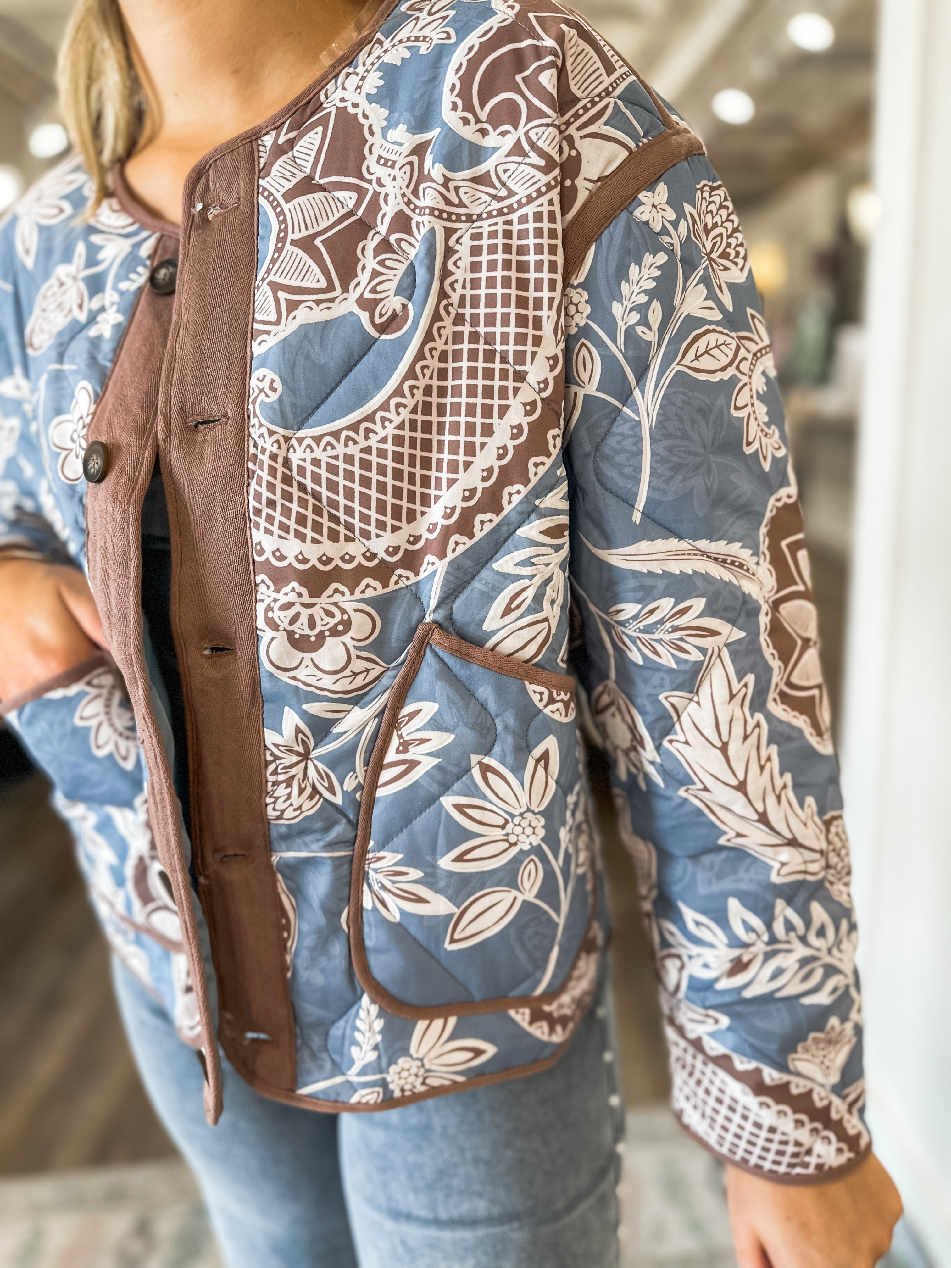• Soft, quilted texture with intricate paisley print in dusty blue and cocoa tones