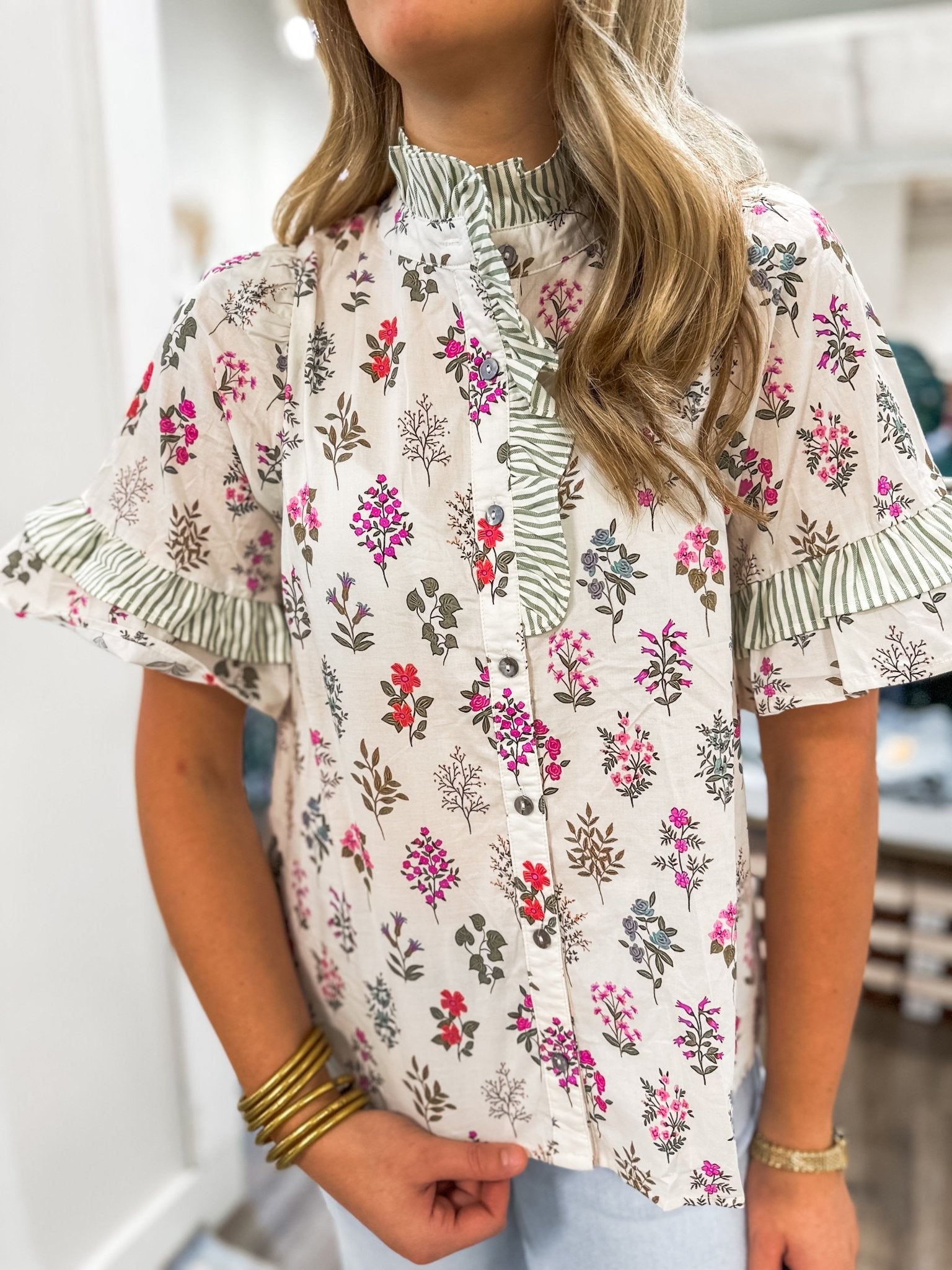 Features: Allover floral print, button-front closure, ruffle-trim neckline and sleeves, lightweight fabric.