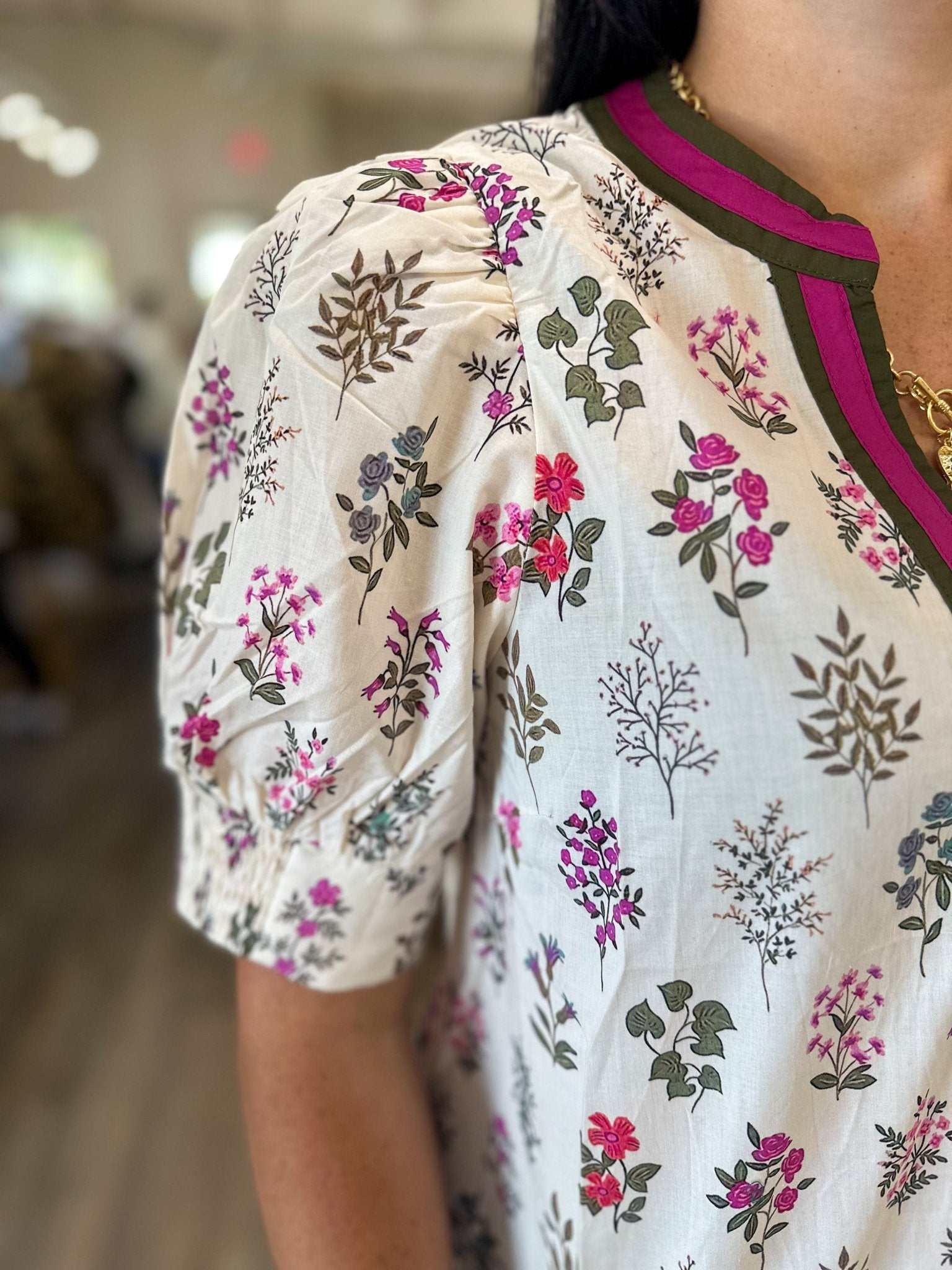 Brighten up your wardrobe with the Cream Rosey Daydream Top – a feminine piece that’s as playful as it is chic. This lightweight blouse features a cream base with delicate rose and floral prints in shades of pink, purple, and green. The bold magenta and olive trim neckline adds a fun pop of contrast, while the gathered short sleeves bring a soft, romantic touch. Perfect for pairing with denim, skirts, or layering under a jacket for cooler days.