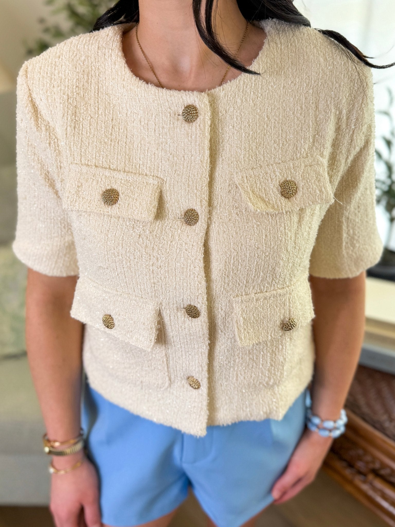 Design: Classic tweed construction, short sleeves, round neckline, functional button-front detail, and decorative front pockets with gold-tone buttons for an elevated finish.