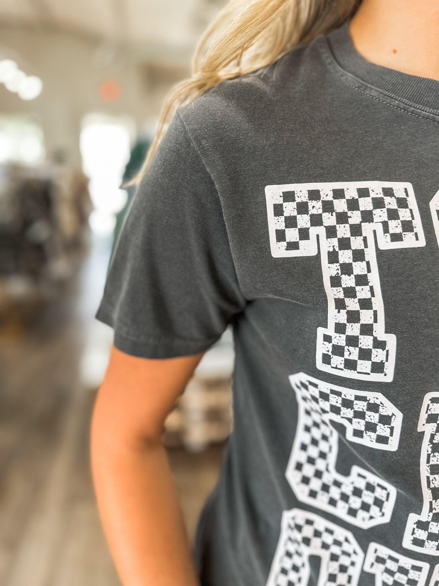 A game day essential that never goes out of style! This dark grey tee features bold checkered “Touchdown” lettering for a sporty, standout vibe. Perfect for cheering in the stands, casual Fridays, or repping your team anywhere.