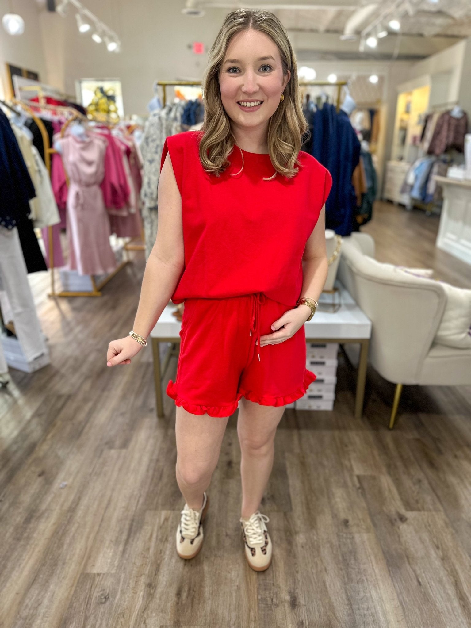 Your game day look just got a major upgrade! This bold red two-piece set is comfy, playful, and perfect for cheering on your team in style.