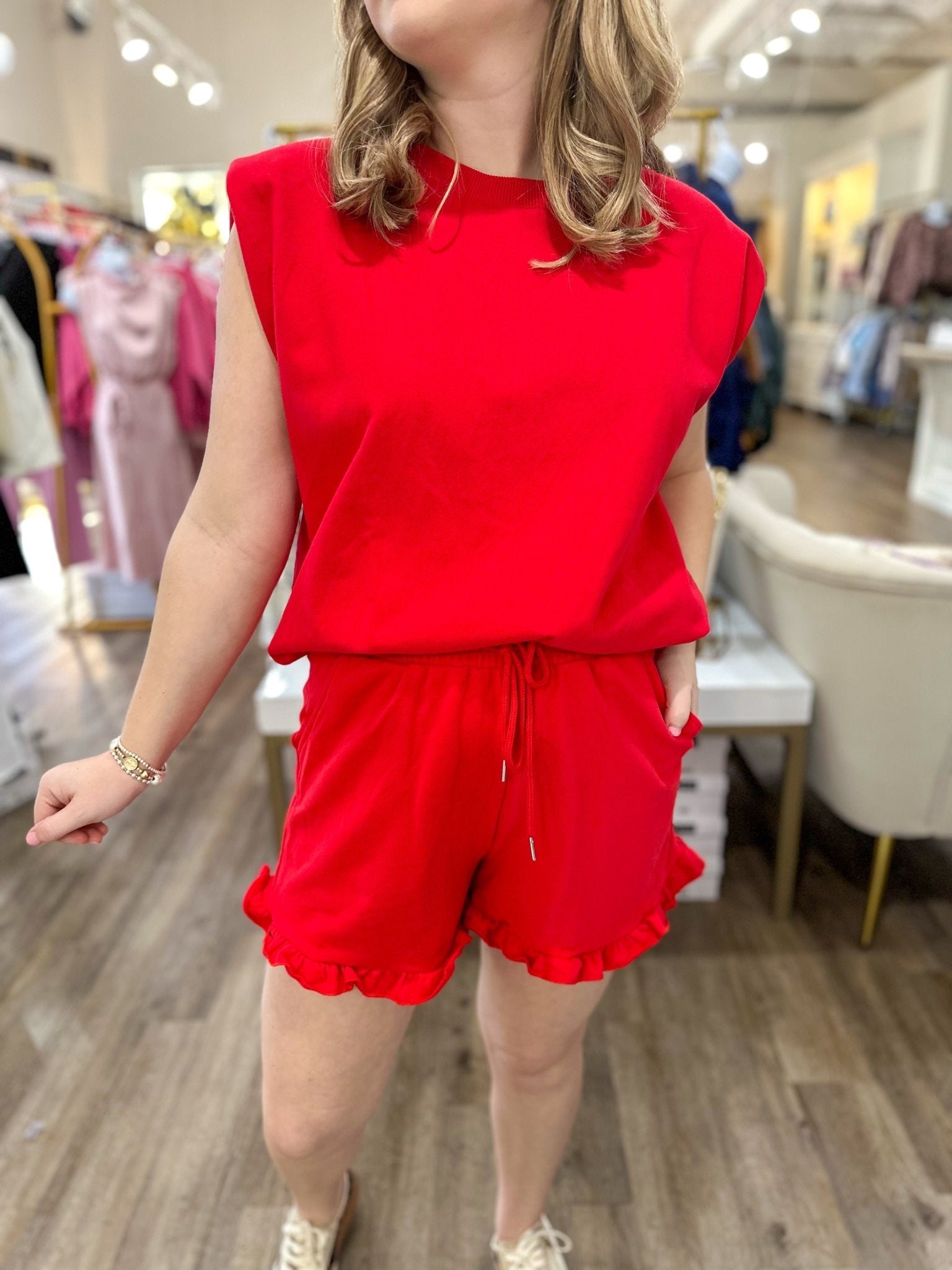 - Flirty ruffle hem on the shorts adds a fun, feminine finish