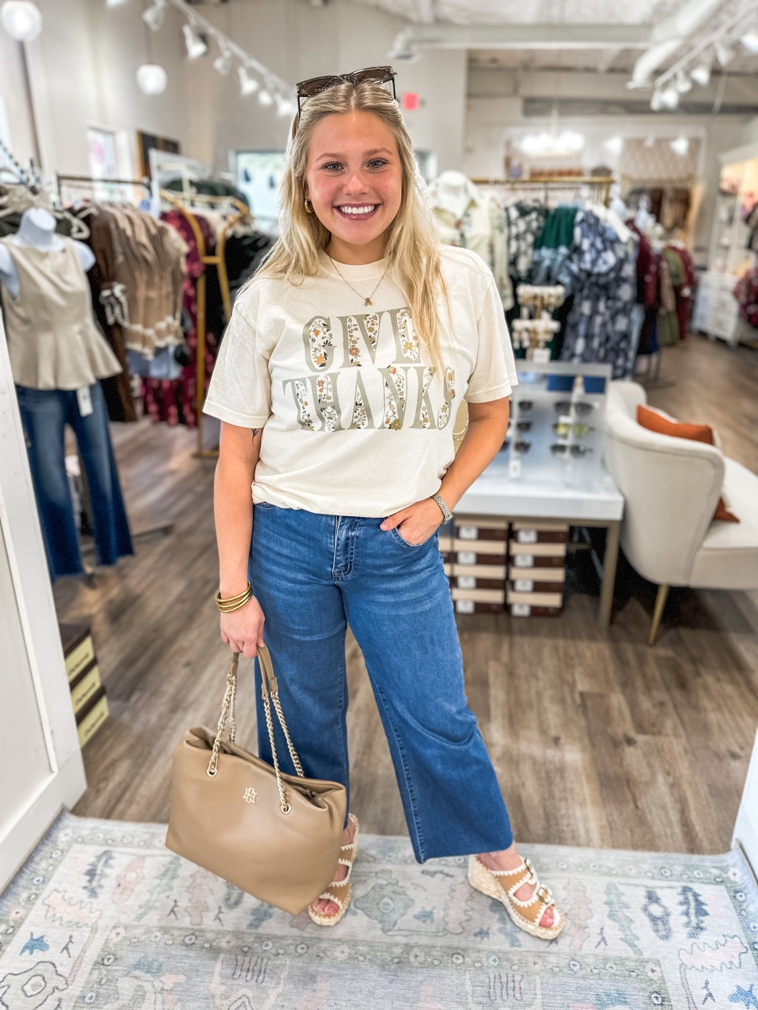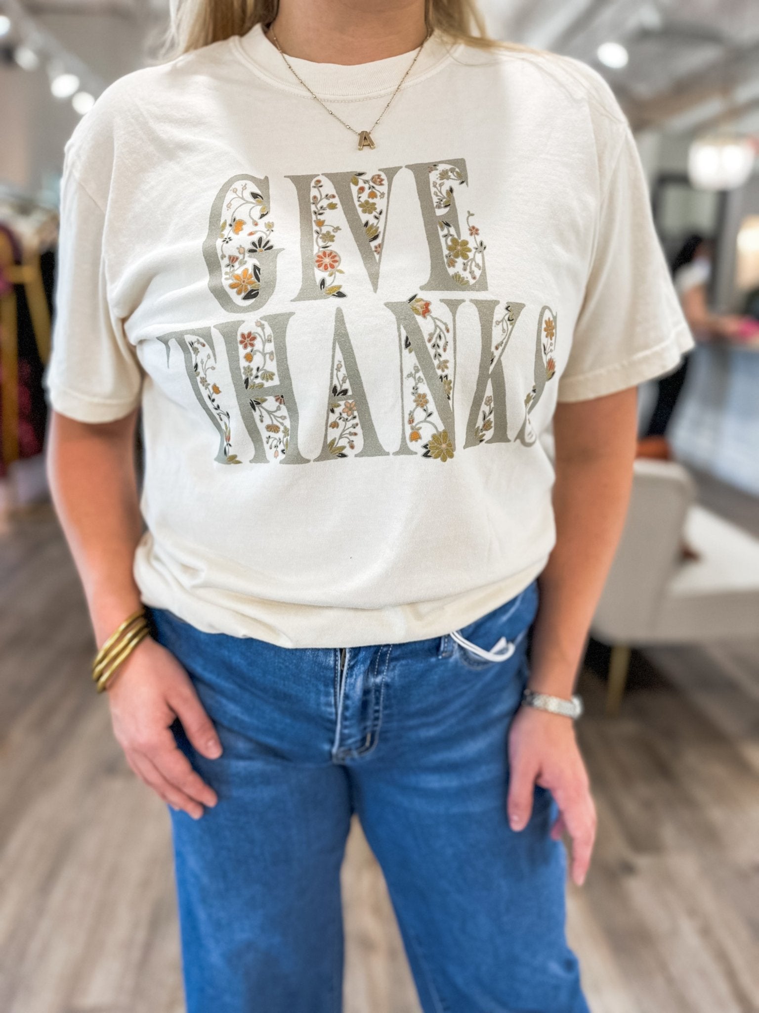 Show your gratitude in style with this comfy graphic tee featuring a bold “GIVE THANKS” print filled with a sweet floral design. Perfect for layering under a cardigan or wearing solo with jeans for an effortlessly festive fall look.